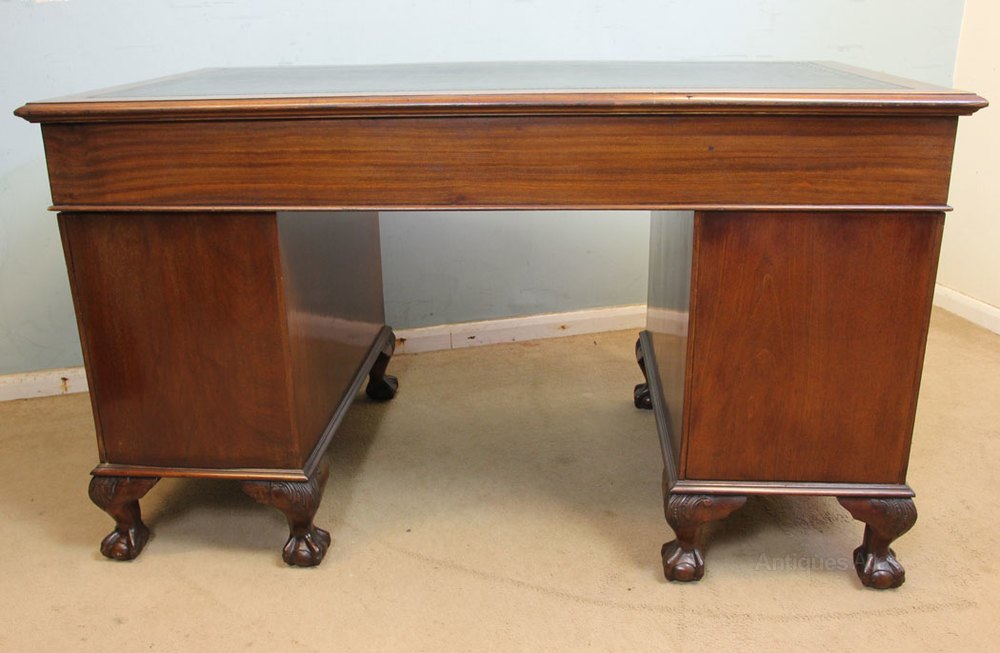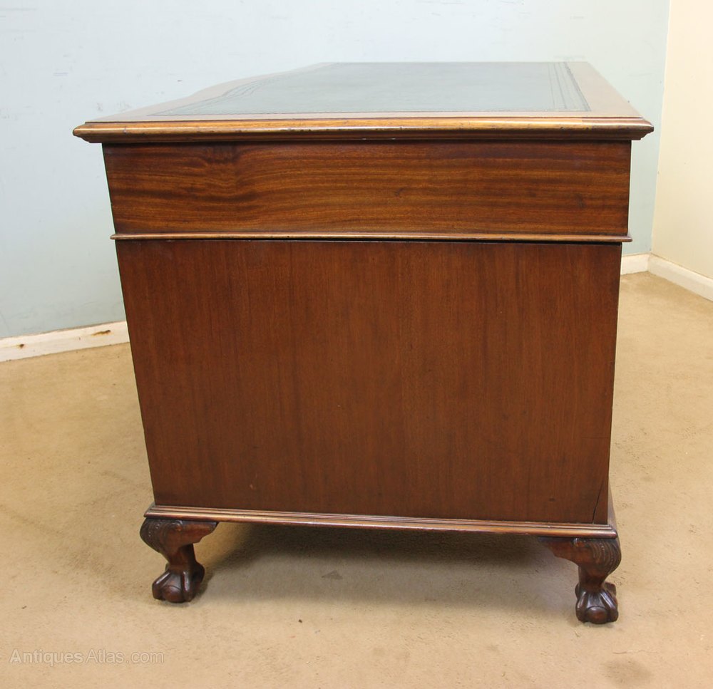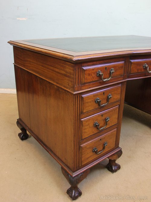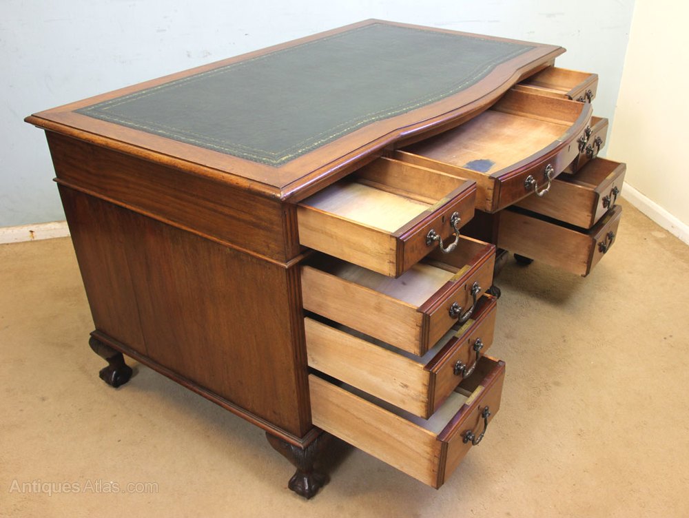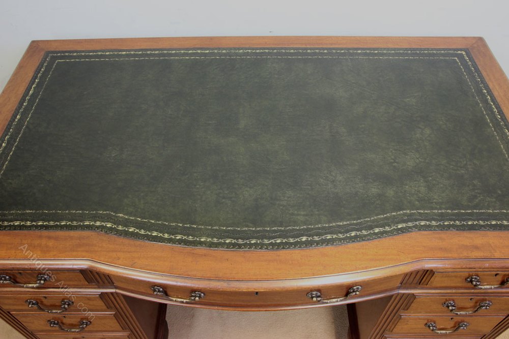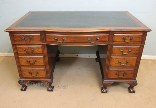 Antique Mahogany Shaped Kneehole Writing Desk. This lovely mahogany shaped kneehole writing desk has leather top insert. Under having shaped centre long drawer flanked either side by four graduated drawers fitted with shaped brass handles and all supported by ball and claw feet. This desk can stand in the centre of a room as this desk is polished all the way round.