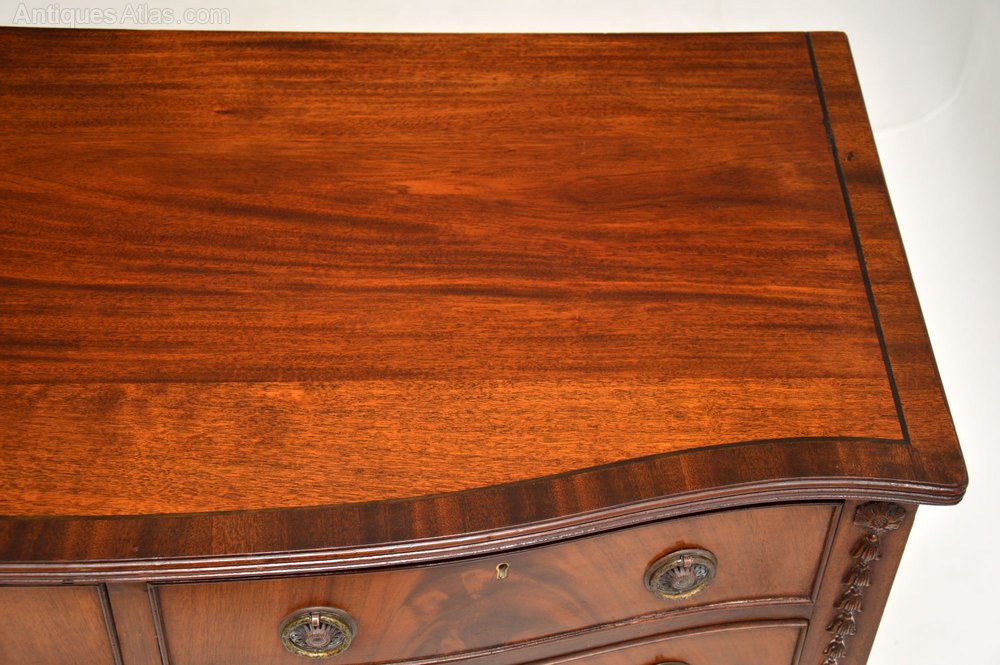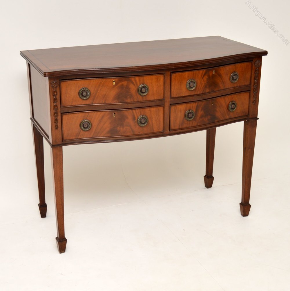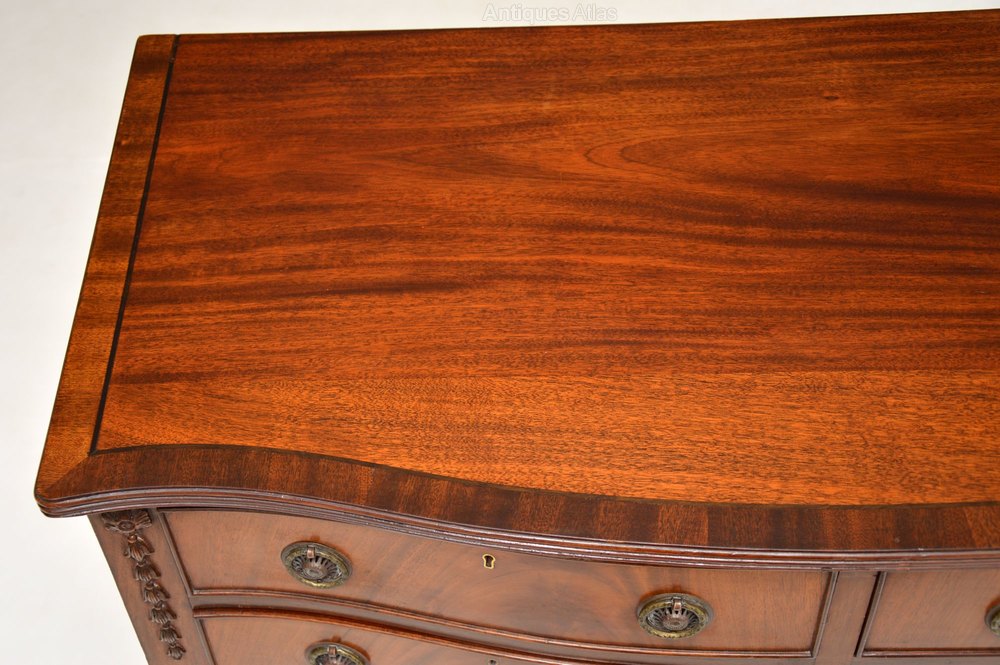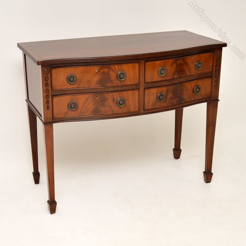 It has a serpentine shaped front, four drawers with brass handles & sits on tapered spade end legs. The top has a cross banded top edge with ebony inlay & reeding on the front. The flame mahogany drawers have locks & fine dovetails. There are also some applied carvings attached to either front side.