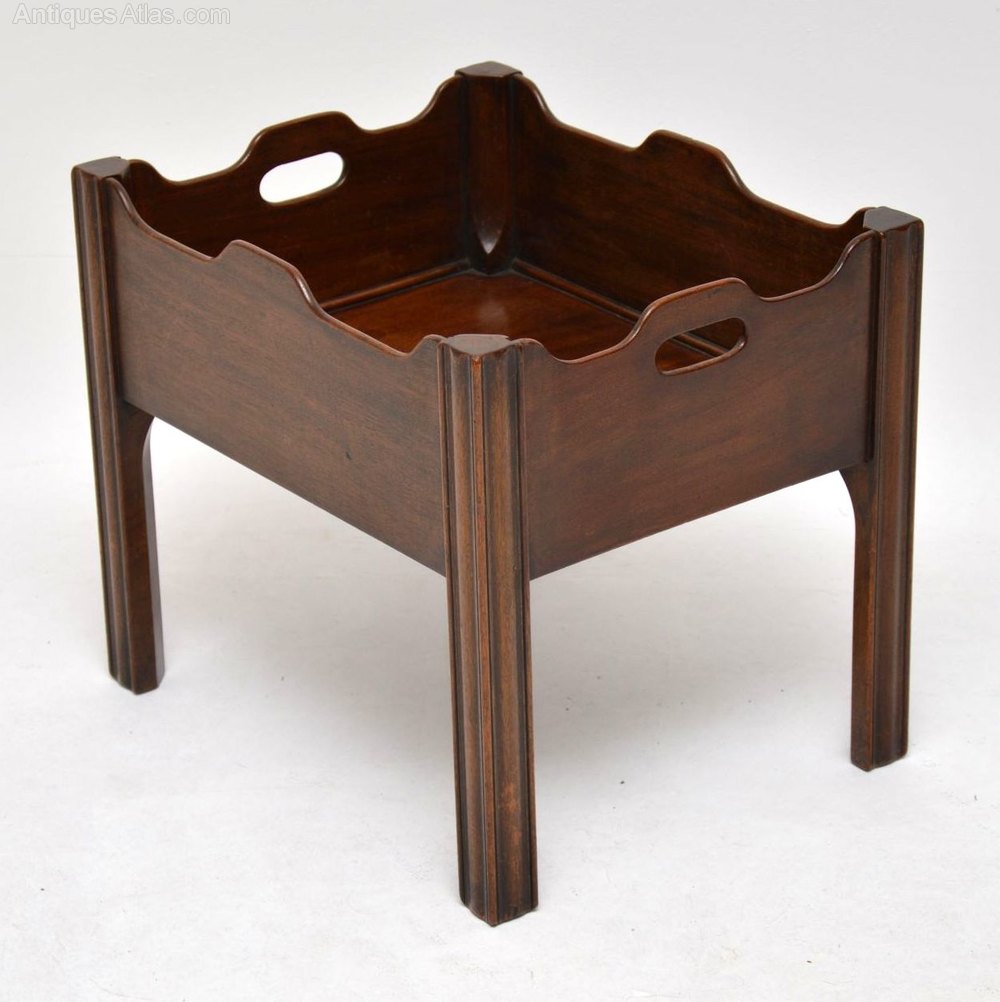 Very unusual small tray top antique mahogany table with a deep compartment inside. I believe it’s actually Georgian & is in excellent condition. I think it was designed to hold bottles or something else & has handles in the sides. It has grooved straight legs which are chamfered inside. I need to have another look at the construction, but I’m fairly sure it’s from the 1790’s period.