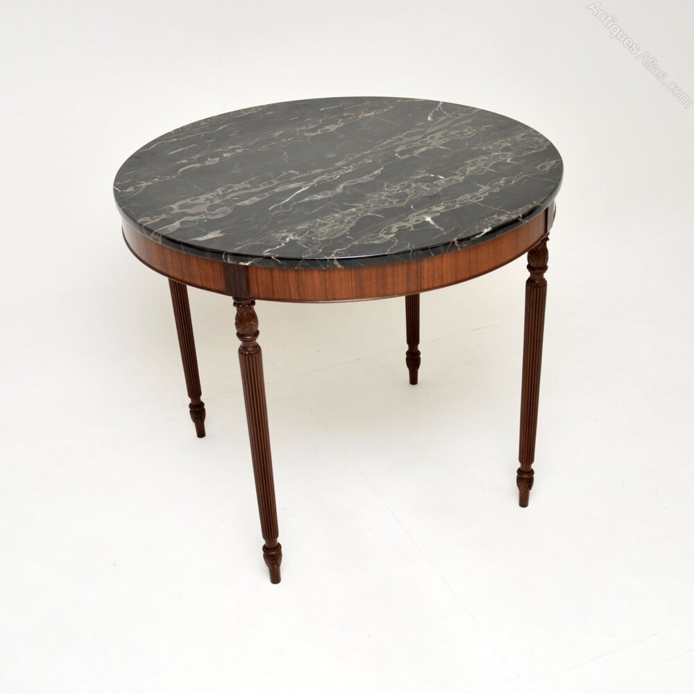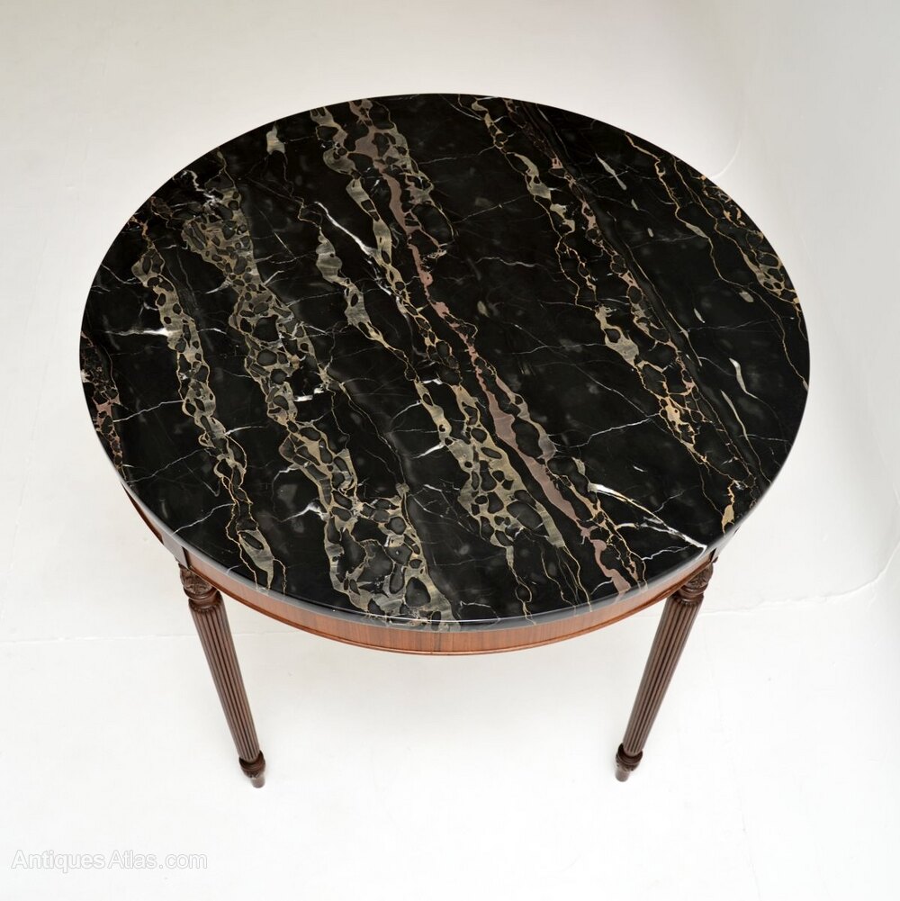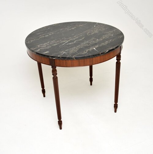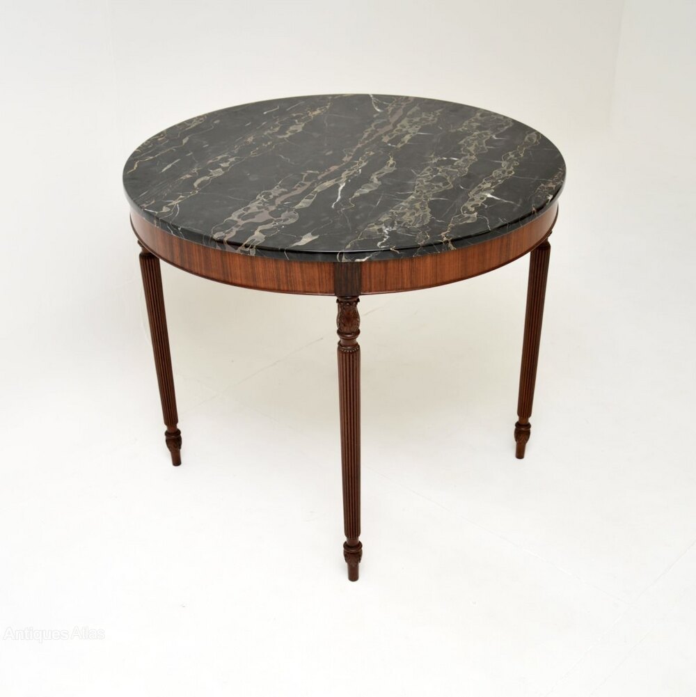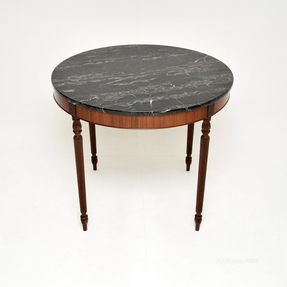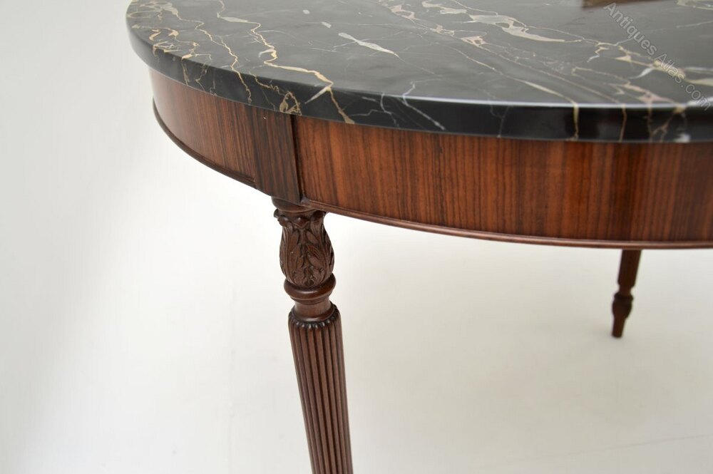 The quality is outstanding, this is a lovely petite size and seats four perfectly. The base is solid mahogany with beautifully fluted and carved legs. The frieze beneath the top has gorgeous zebrano veneers. The circular marble top is a stunning colour of mainly black, grey and white tones, it sits loose on the base and can be removed for ease of transport.