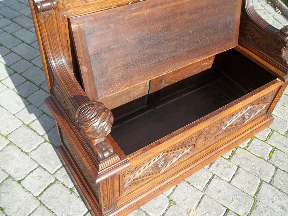 Antique Victorian 19th century carved oak box settle. This narrow small hall two seat chair is exquisite quality and has the more desirable diminutive proportions and would equally suit as a toy box or bed end sofa. The whole is carved with The green man motif and the lift up lid is flanked by two carved naive lions. Circa 1890. This piece has been fully restored and is in excellent condition and is ready to place in your home. Measures 48"w x 44"h x 18"d