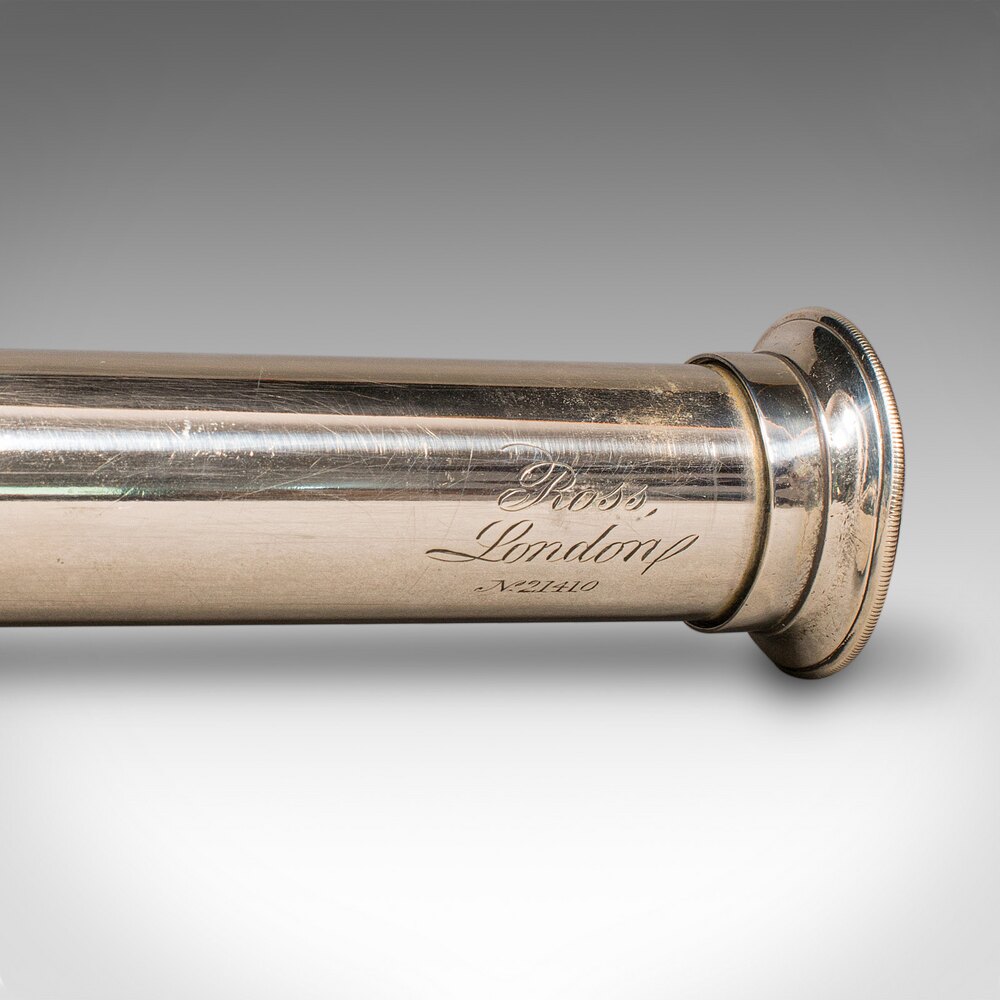 This is an antique Officer of the Watch telescope. An English, brass single draw terrestrial or marine spyglass by Ross of London, dating to the late Victorian period, circa 1900. A characterful example with a tactile later finish and fine optical presence.