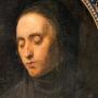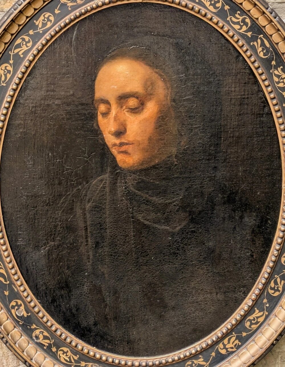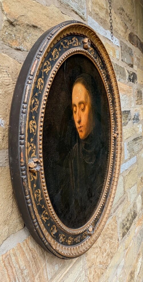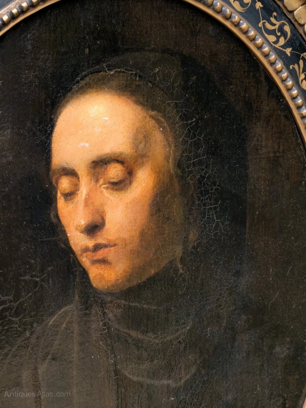 This is a good antique oil painting on canvas dating from the late 18th or early 19th Century in later frame. The saintly female figure with downcast gaze is very enigmatic and the well executed painting has real atmosphere.