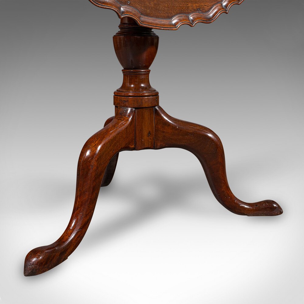 This is an antique pie crust side table. An English, mahogany tilt-top games or occasional table, dating to the Georgian period, circa 1790. A fine example of 18th century craftsmanship, displaying the period-favourite pie crust form and elegant proportions.