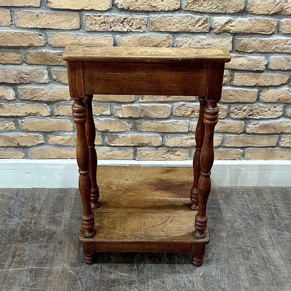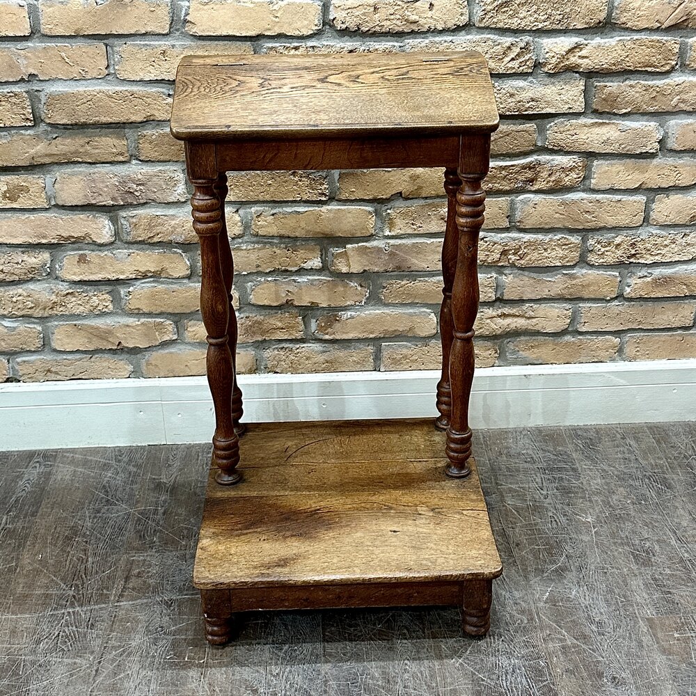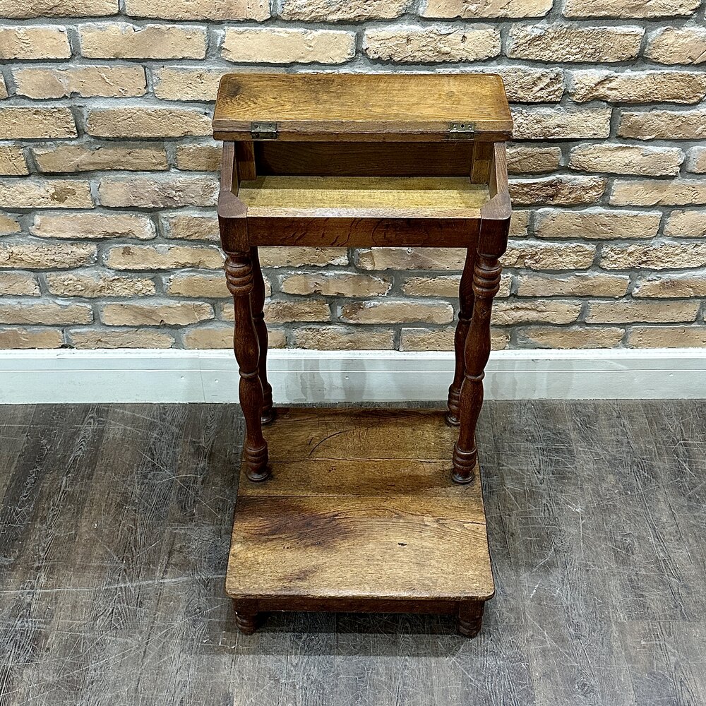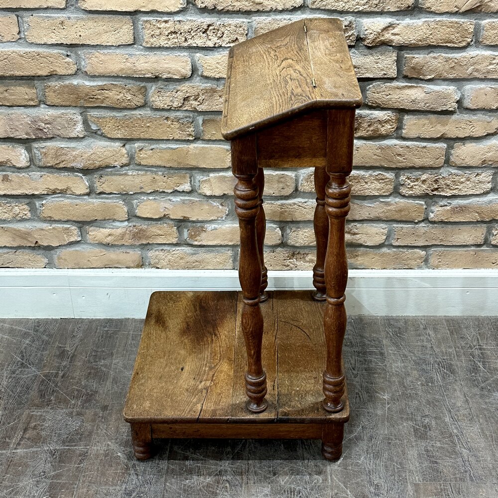A charming piece from the 1920s with this exquisite solid oak praying table. Expertly crafted, its legs boast hand-turned detailing, imparting a rustic yet pleasing aesthetic. This table's thoughtful design extends to its lift-up top, providing convenient storage space.
