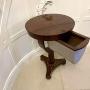 To one side, a pull-out work drawer opens to reveal the traditional suspended fabric work bag used historically for needlework and fine personal effects.