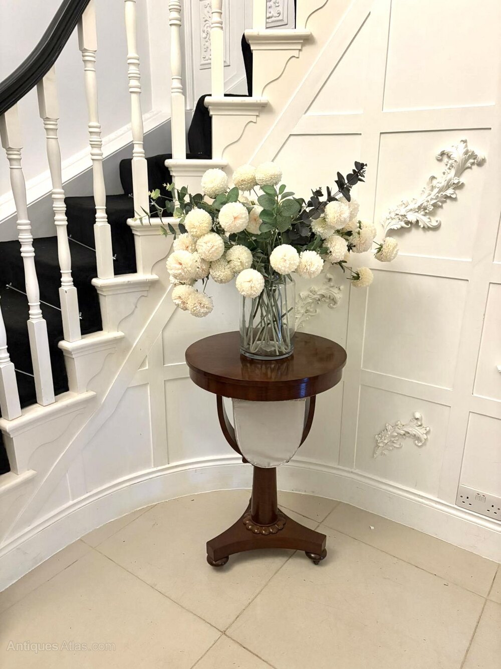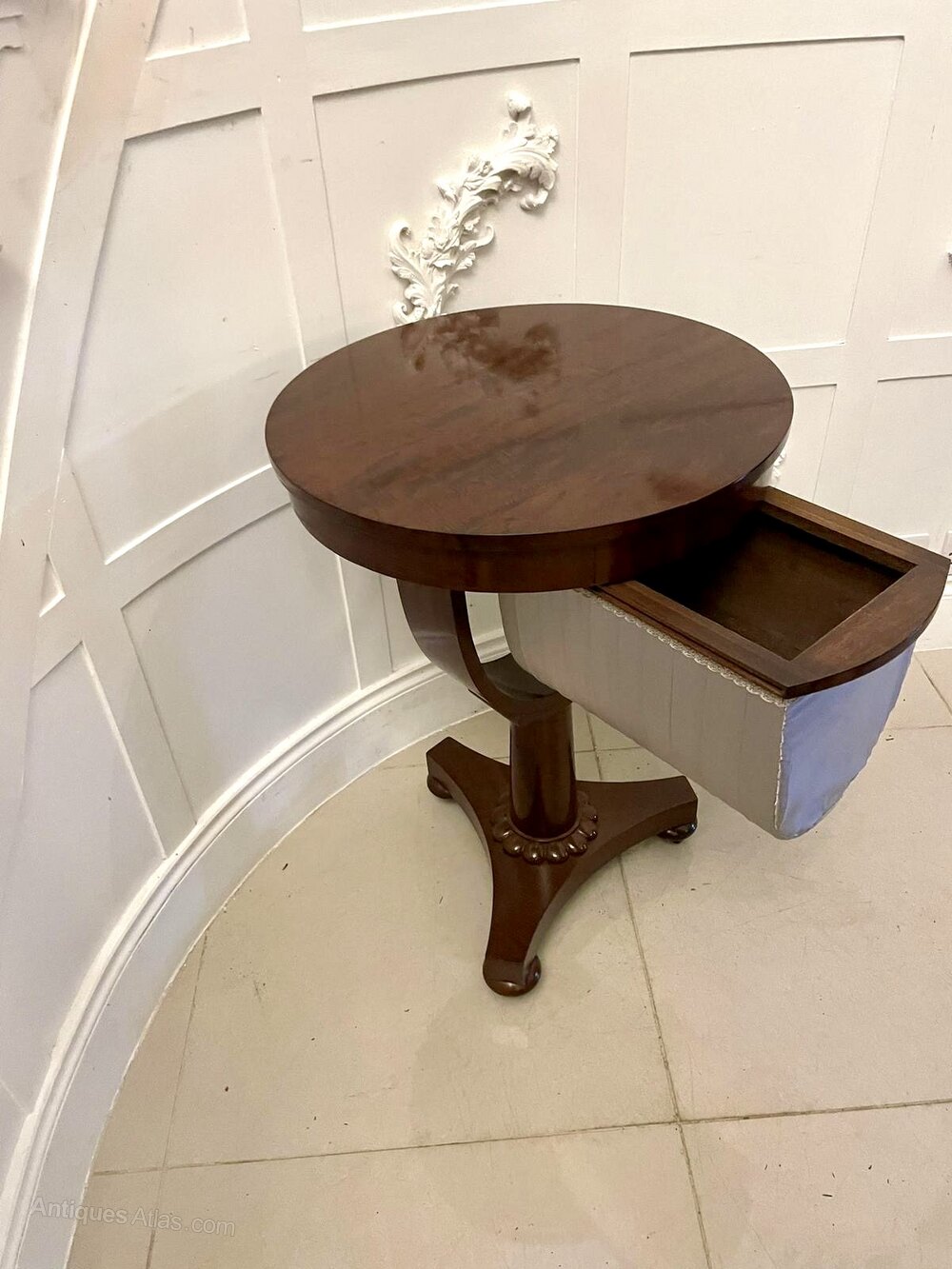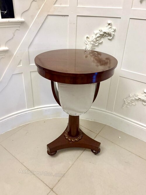 An elegant Victorian circular sewing / lamp table in richly figured mahogany. The circular top is supported on a refined U-shaped stretcher descending to a turned central column and a well-formed tri-form base terminating on original concealed castors.