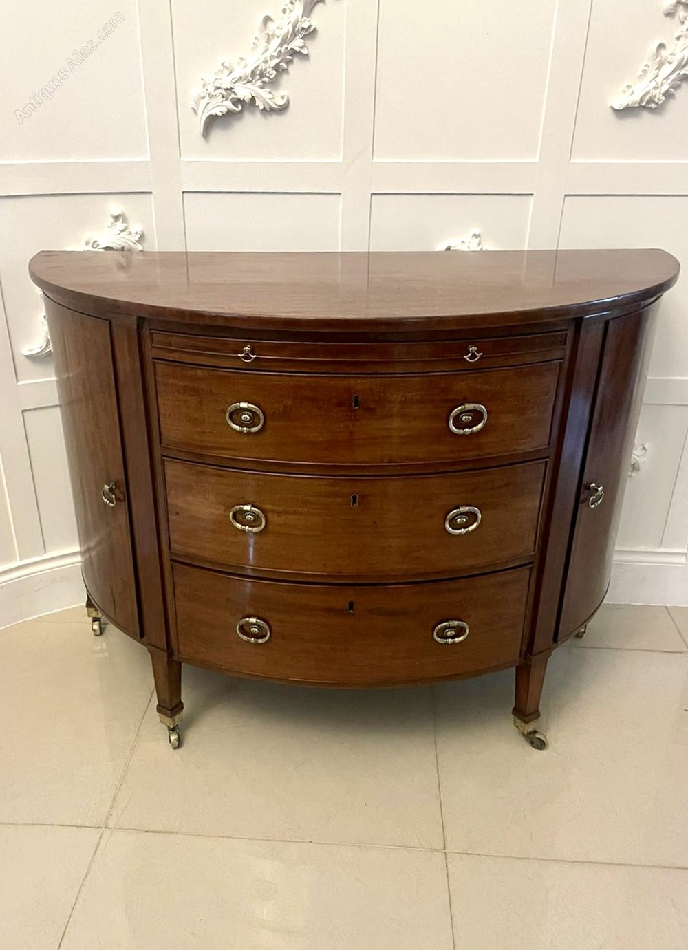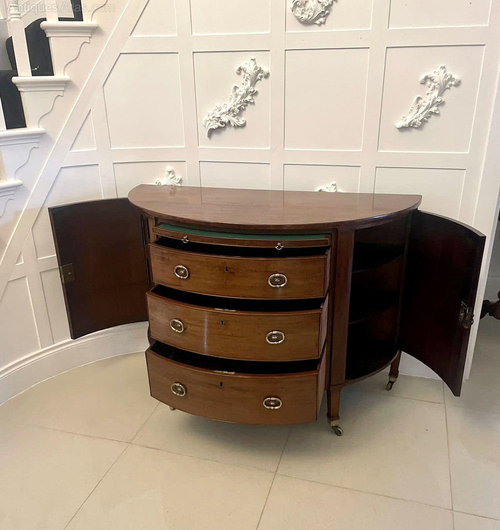 Antique George III quality mahogany demi lune shaped commode/chest of drawers having a quality mahogany demi lune shaped top above a blushing slide and three mahogany cockbeeded oak lined drawers with ornate brass handles flanked by cupboard doors opening to reveal a shelf storage area and standing on square tapering legs with original brass cup castors