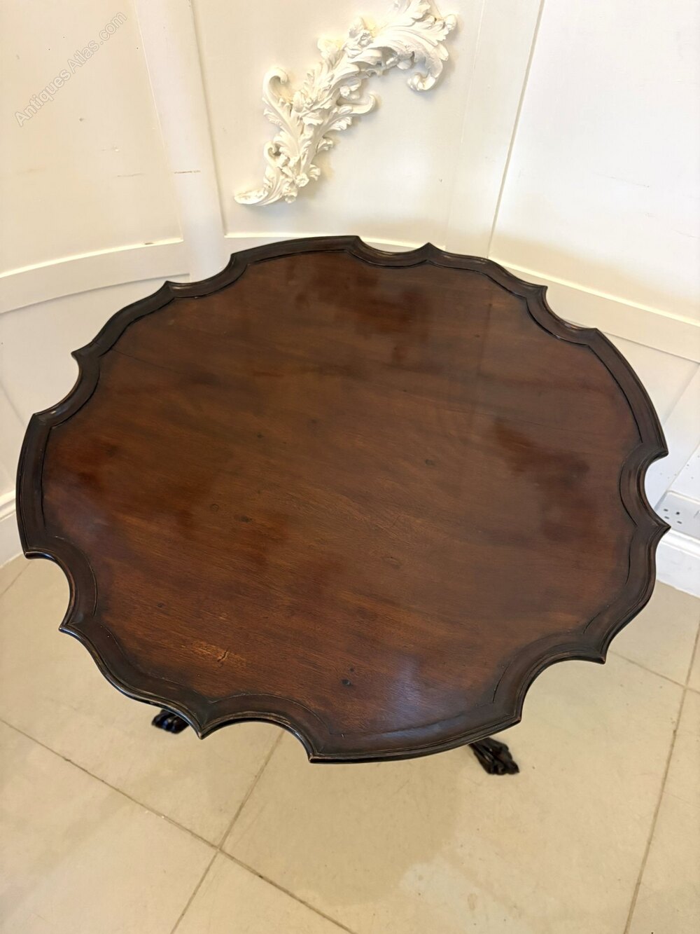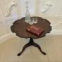 A well-proportioned Antique George III mahogany centre table, standing on a finely carved tripod base with elegant cabriole legs terminating in bold claw feet. The circular top is attractively shaped with a scalloped outline and a subtle moulded edge, lending both movement and refinement to the design. The mahogany displays a rich, warm tone with an appealing patina, highlighting the quality of the timber and the confident late 18th-century craftsmanship. Of practical and versatile scale, this table is well suited for use as a centre table, lamp table, or occasional table, fitting comfortably into both classic and contemporary interiors.