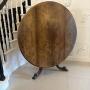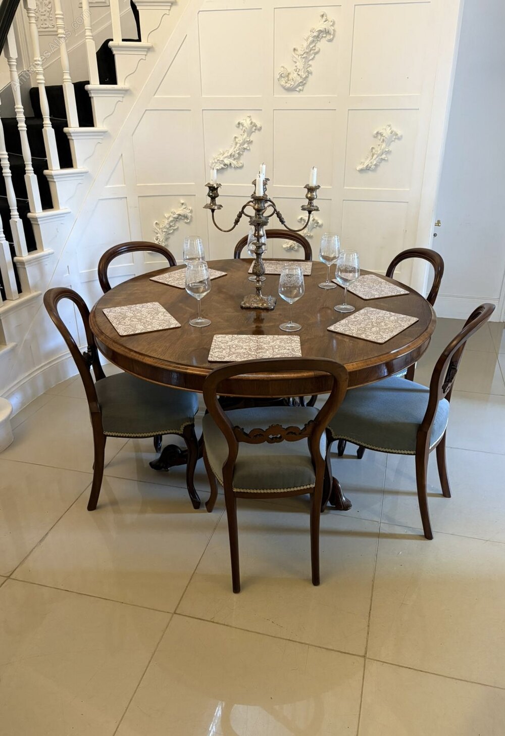 Antique Victorian quality carved rosewood circular dining table having a quality rosewood circular tilt top with a thumb moulded edge supported on a shaped reeded pedestal column standing on three shaped carved solid rosewood cabriole legs with scroll feet and original castors.
