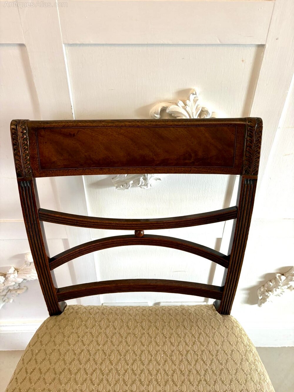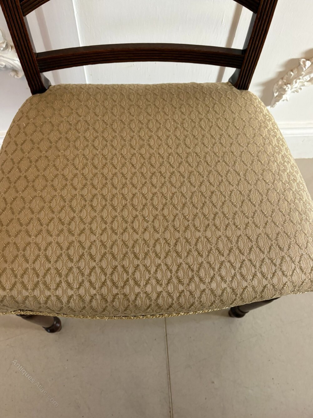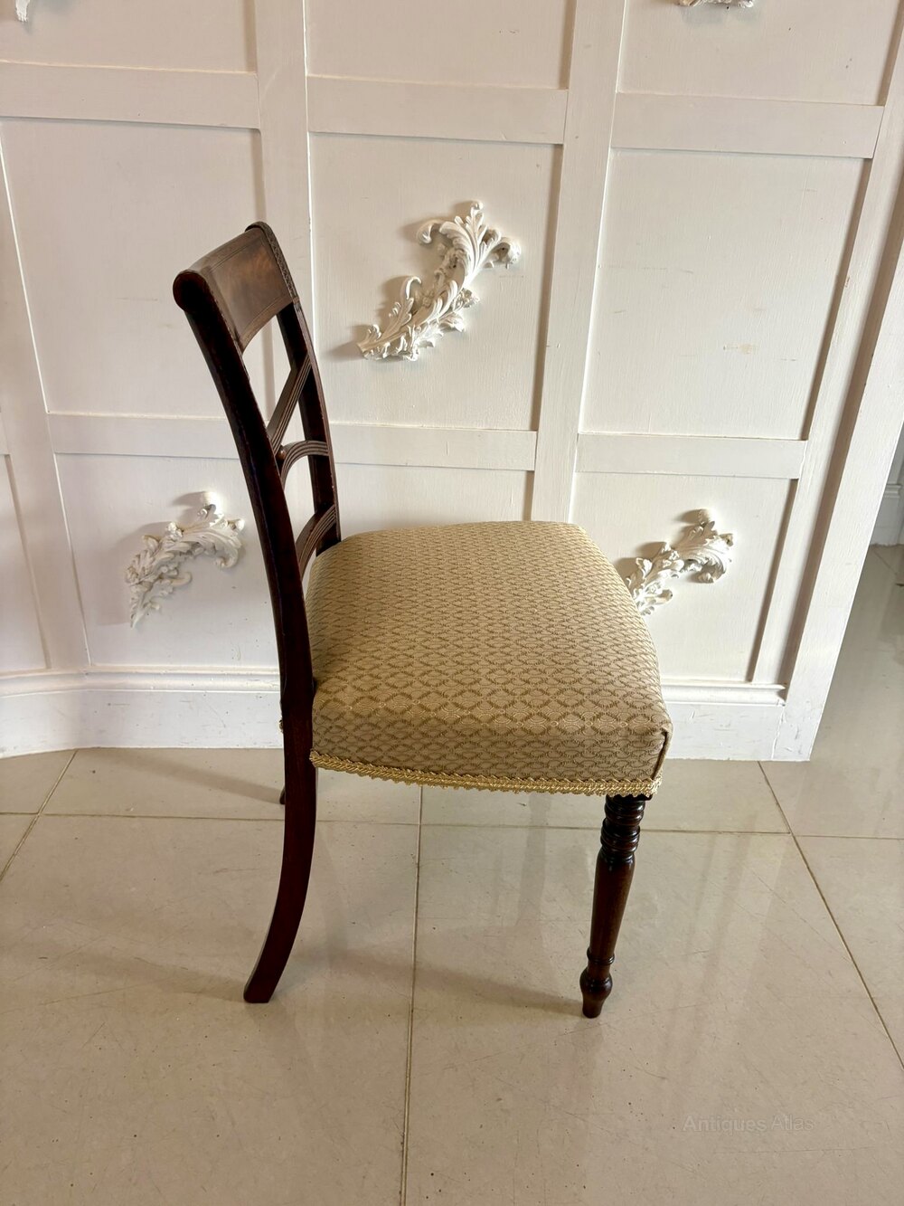The chairs are in excellent condition for their age, the mahogany frames standing sturdy with no looseness or movement. The reeded backs and turned legs remain crisp and well defined, showing only minor age-related surface marks consistent with genuine period use. The seats have been newly reupholstered, offering a clean and comfortable finish. Overall, a very well-preserved and ready-to-use set.