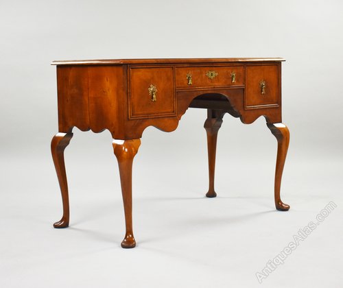 For sale is a good quality antique Queen Anne revival walnut lowboy. Having a quarter veneered top, over three drawers, each with brass handles and herringbone banding. Standing on elegant cabriole legs the lowboy remains in good condition, showing minor wear commensurate with age and use.