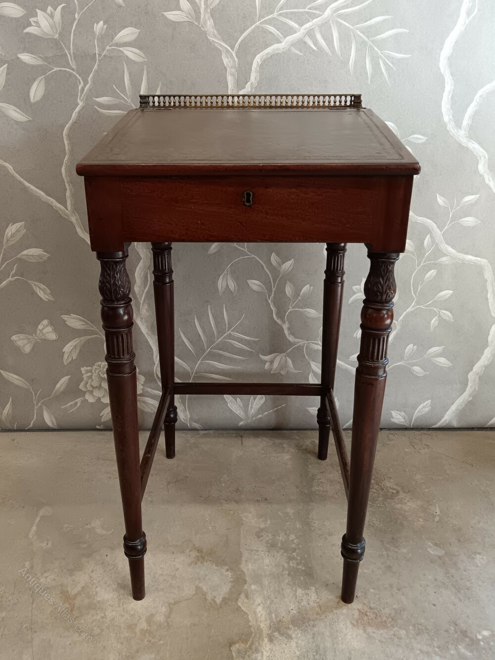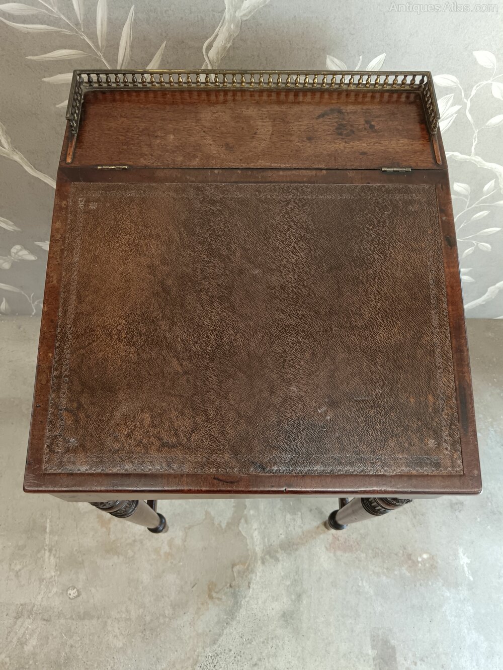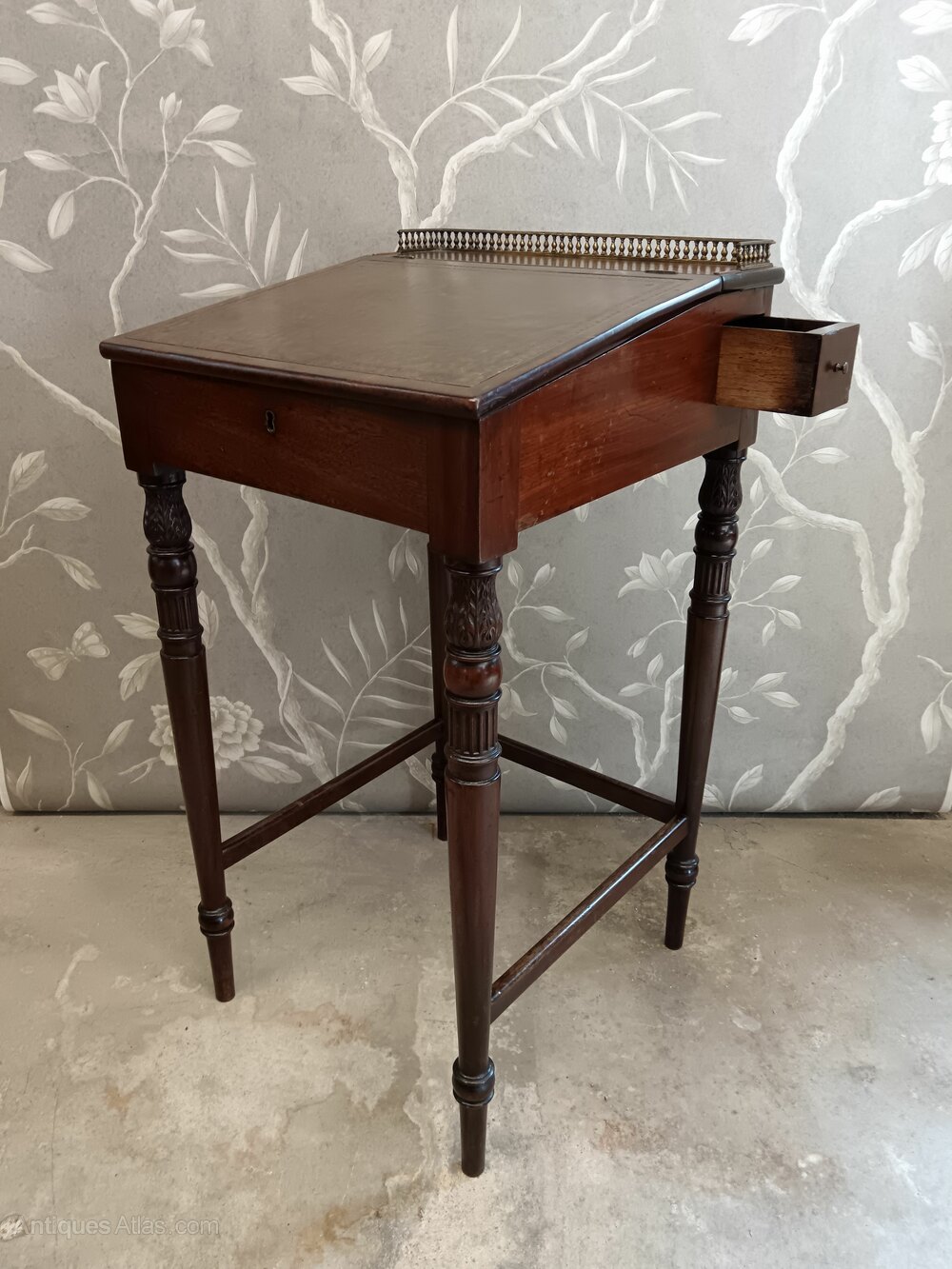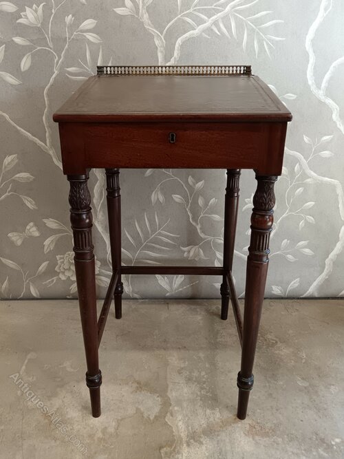 A delightful mahogany writing desk of small proportions raised on beautifully turned legs with carved capitals.