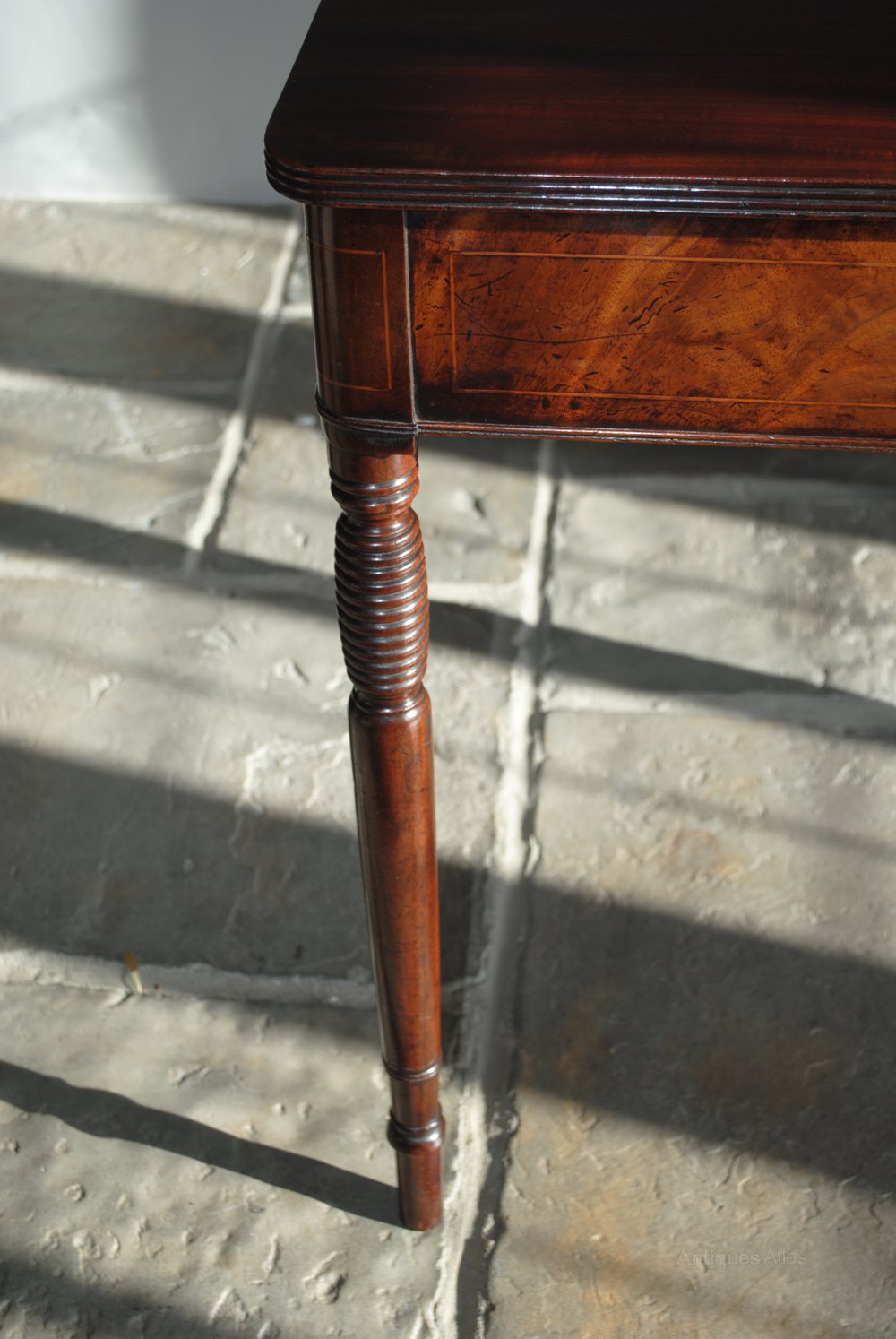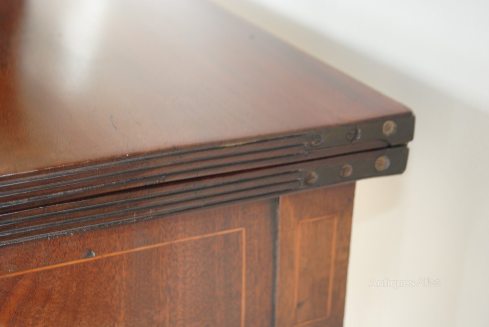 With the beautifully turned legs so typical of the period and line inlay detailing, it sits very comfortably as a side or console table, but can be easily folded out to make a small dining table or tea table (as they were originally called)!
