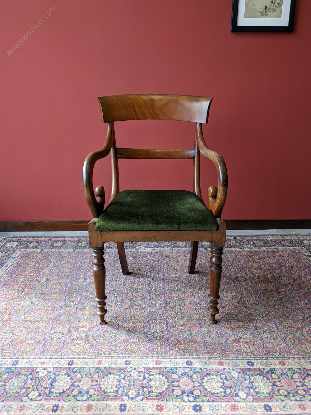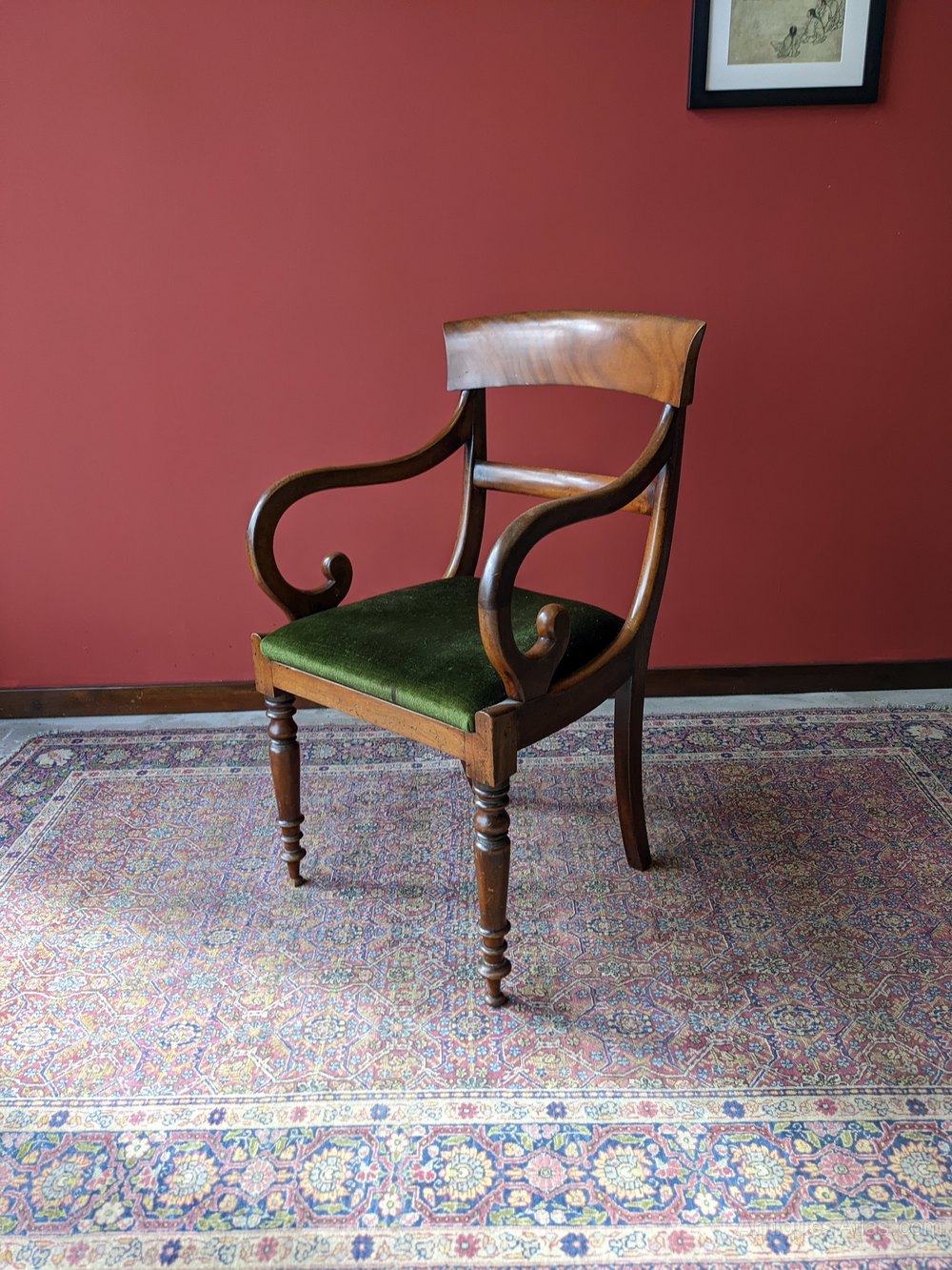 A beautifully shaped late Regency period mahogany library chair with attractive scroll arms, upholstered in a lovely green velour fabric.