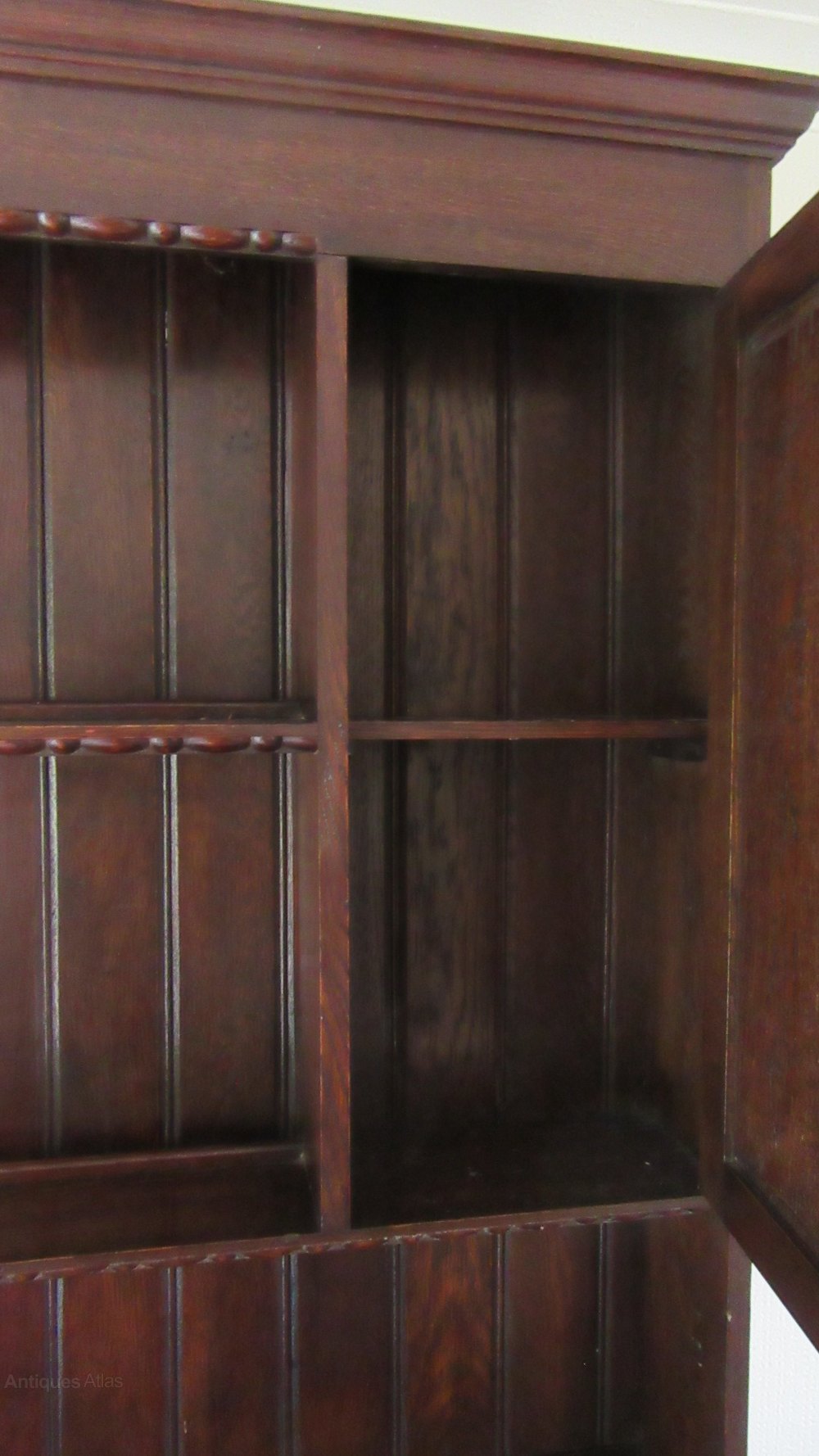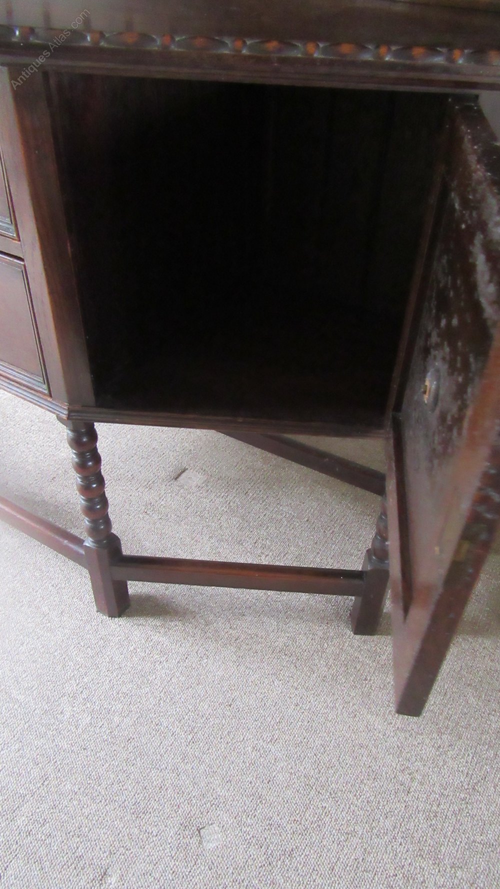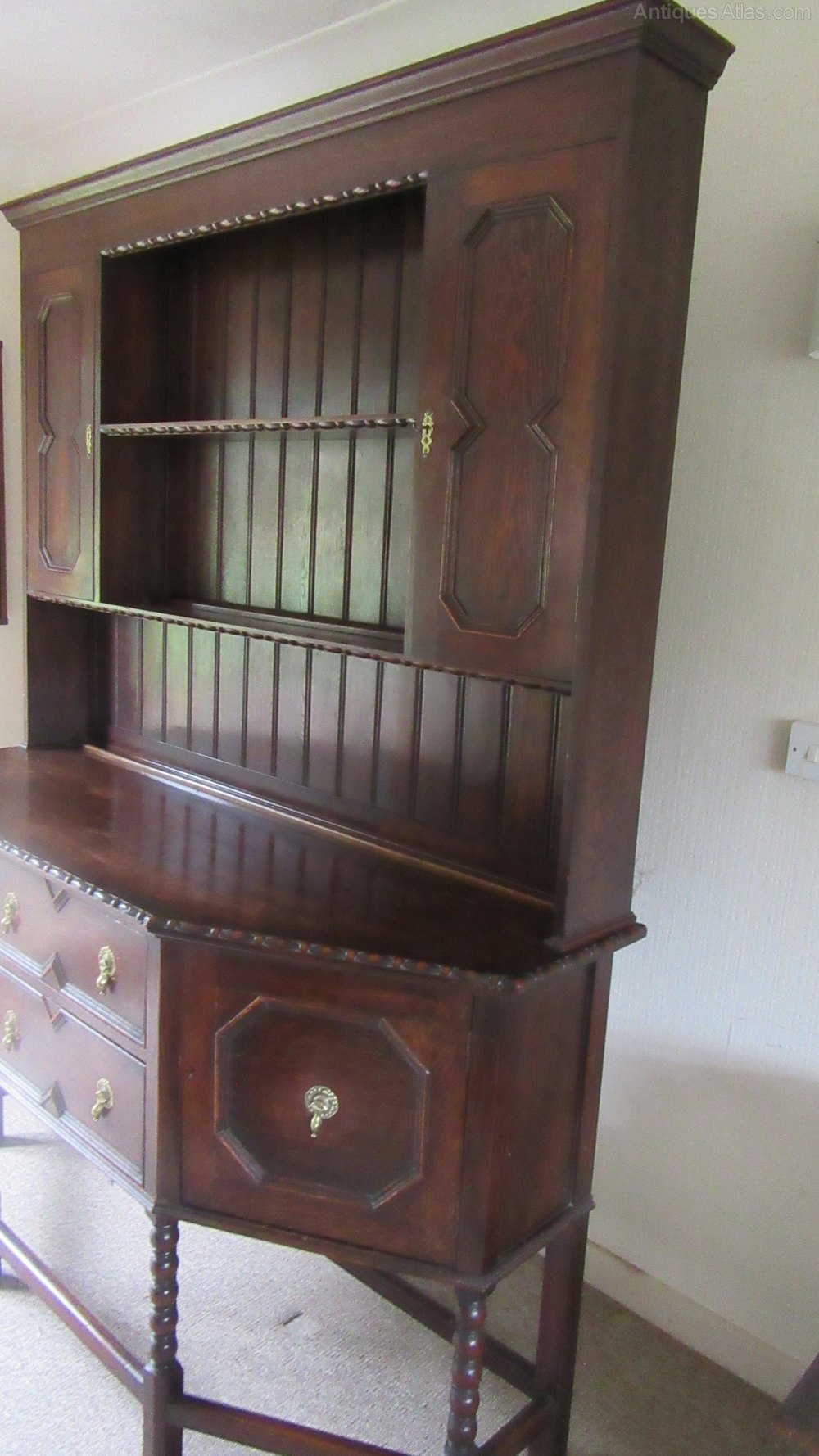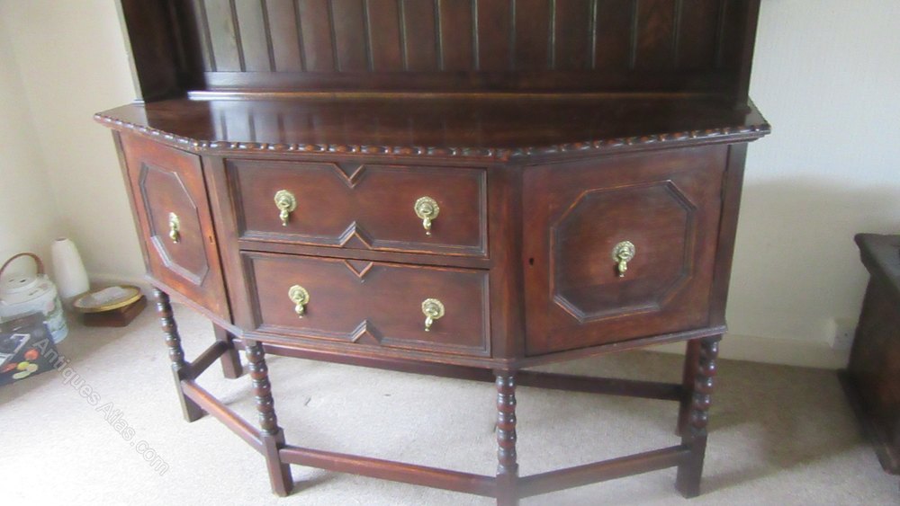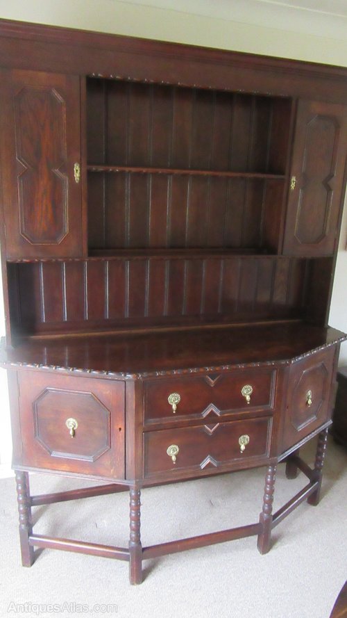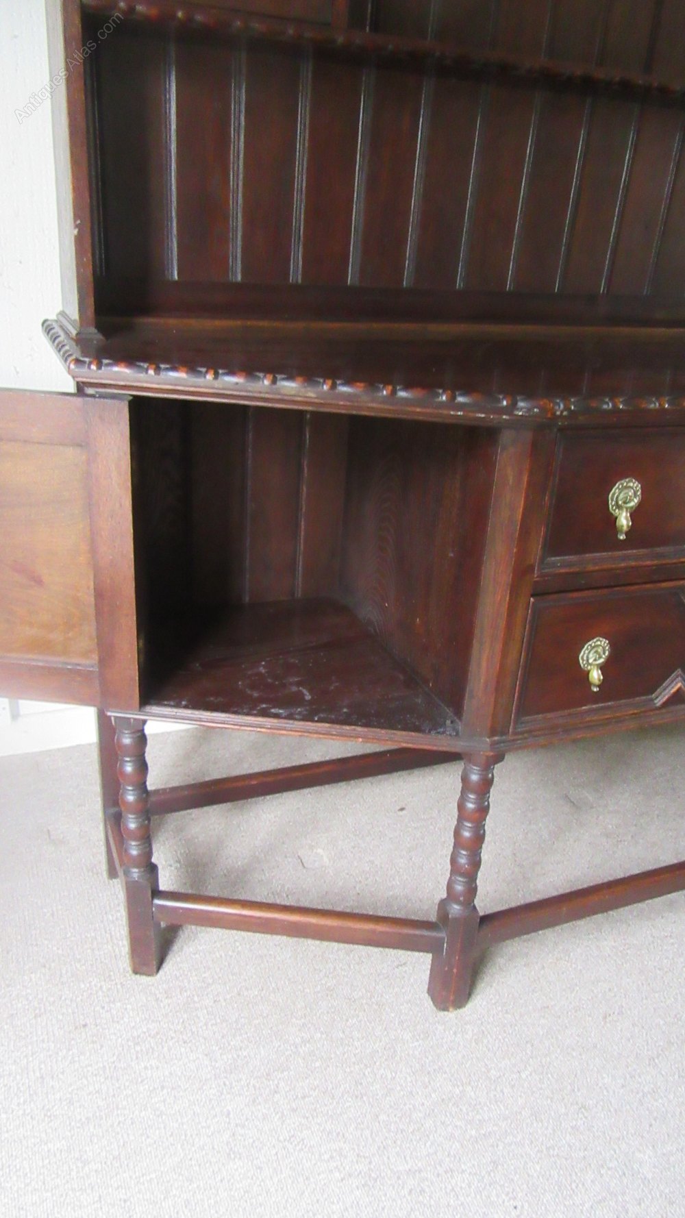 Antique Shaped Oak Dresser with Plate rack and two cupboards to the Top over Two Drawers and Corner Cupboards Below on Bobbin Legs Good Rich Oak Colour 204 cm high 152 cm wide 56 cm deep