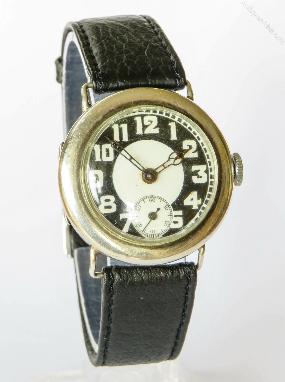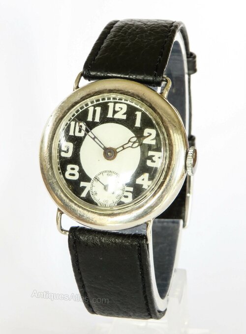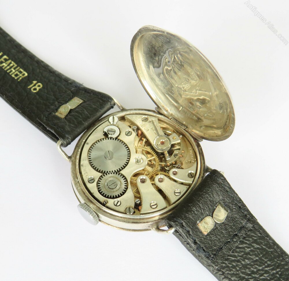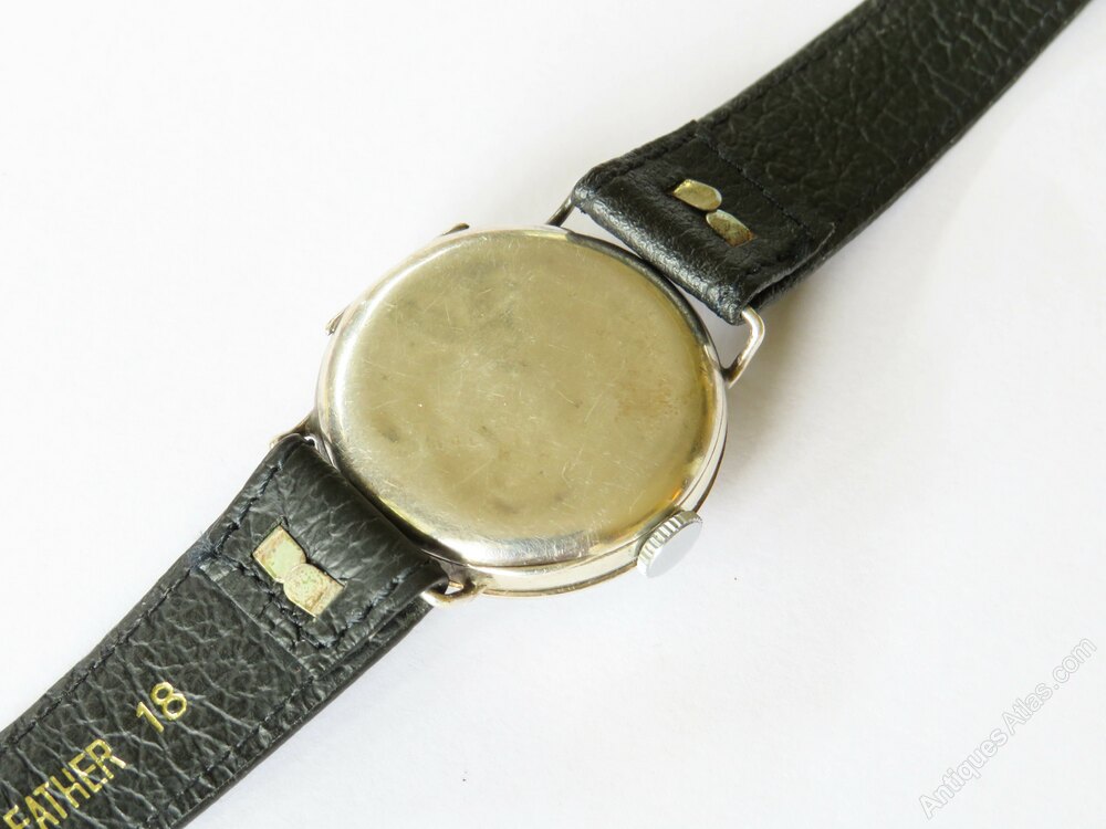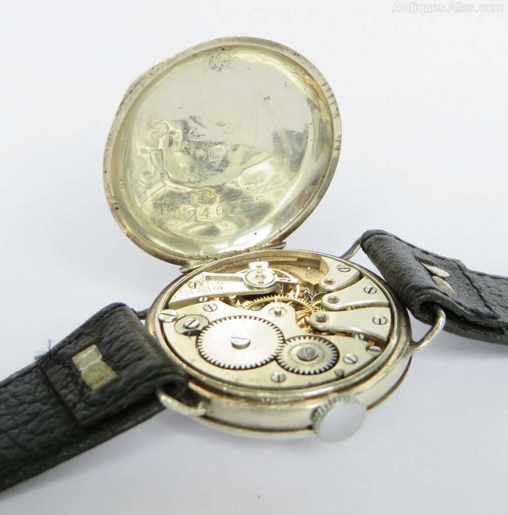 The watch measures 33mm diameter excluding the later winding crown and fixed wire lugs. The case is silver and there are hallmarks inside the hinged case back for London 1917. The front and sides of the case are in good condition, the hinged case back has unevenness.