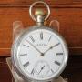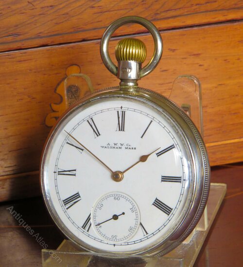 The watch measures 50mm diameter excluding the winding stem and the loop. The case is silver and there are hallmarks inside the screw-on case back for Birmingham 1899, with a sponsor’s mark of AB for Alfred Bedford, manager of Waltham UK. The case is in good condition. There is a pattern to the back of the watch which has worn down with use over the years.