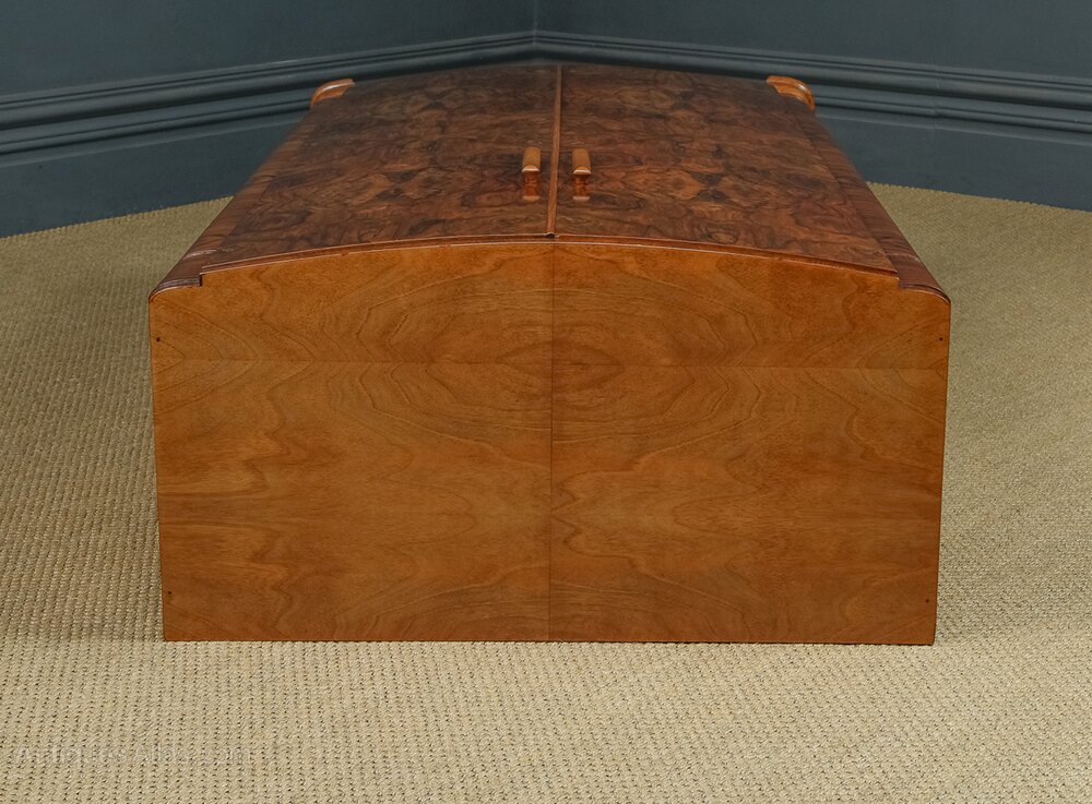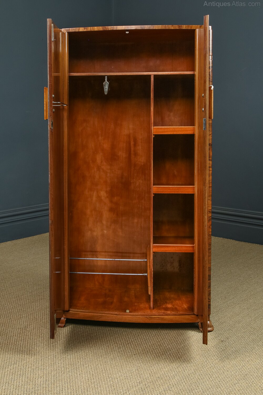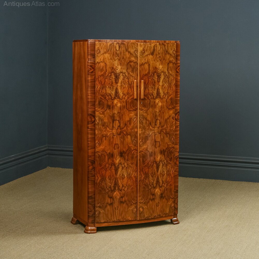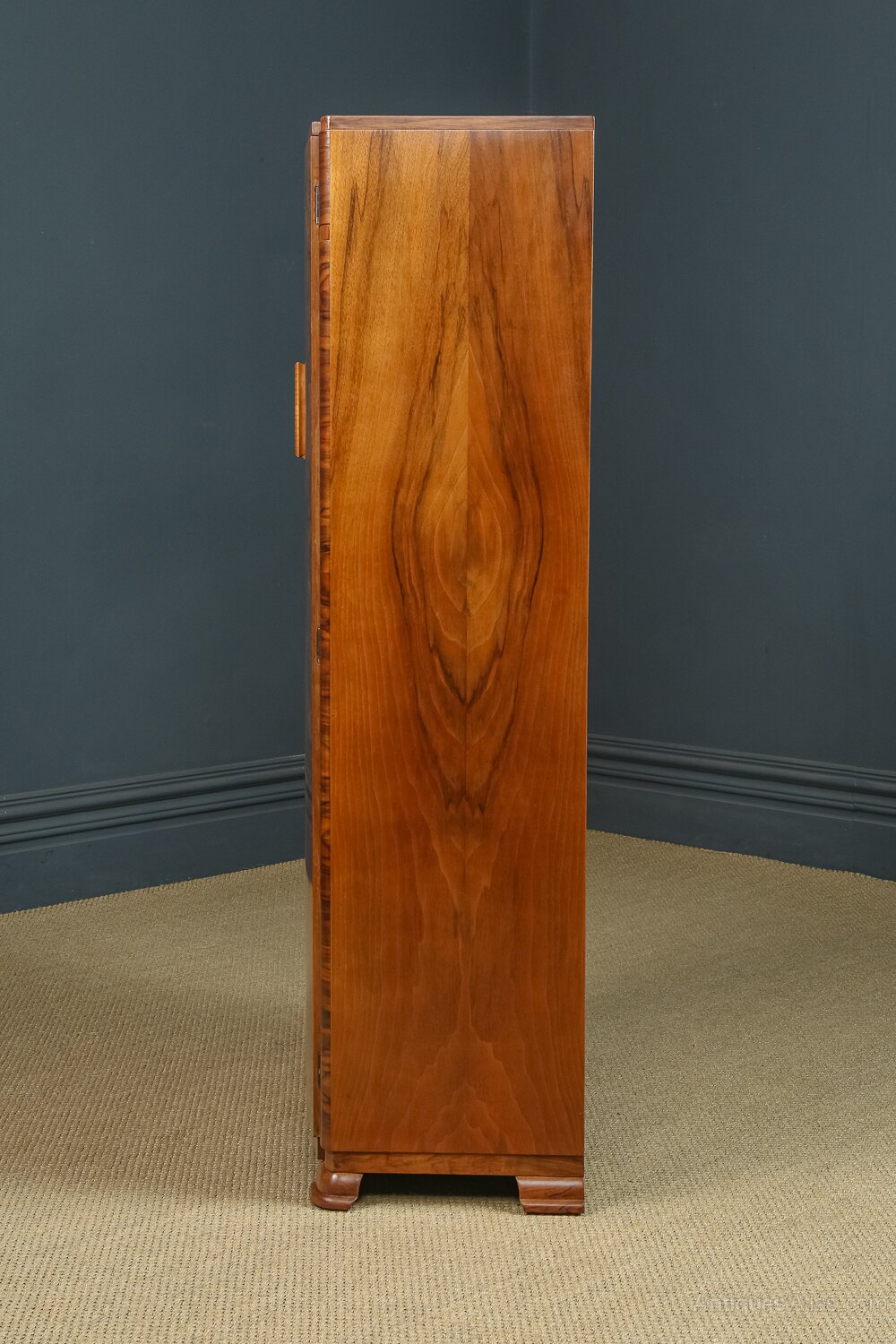 Condition This is fine quality antique English Art Deco two door wardrobe, circa 1930, with small proportions, displaying stunning burr walnut timbers, in excellent original condition. This small Art Deco wardrobe has been cleaned and traditionally French polished by hand to a professional standard in our workshop, therefore the patination and colour of an excellent standard. Nominal old use marks to the leading external edges, sides and interior, but nothing significant considering the age of the item. All internal door locking catches are present and in good working condition. The Art Deco wardrobe retains its original shaped vertical wooden handles and curved bracket feet. The door incorporates a working lock and key. The two metal shoe bars at the bottom of the wardrobe (below the hanging rail) are in good condition. There are no splits to the doors and they close flush to the frame. The interior is clean and the wardrobe is solid in joint and ready to use.