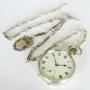 The watch comes with a later silver double albert, each chain measures 25cm long including the T-bar and the clasp. The clasps are stamped Sterling Silver and there are hallmarks on the T-bar ring but difficult to read. There is also a shorter length of chain which has a silver fob hallmarked for 1925.