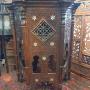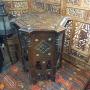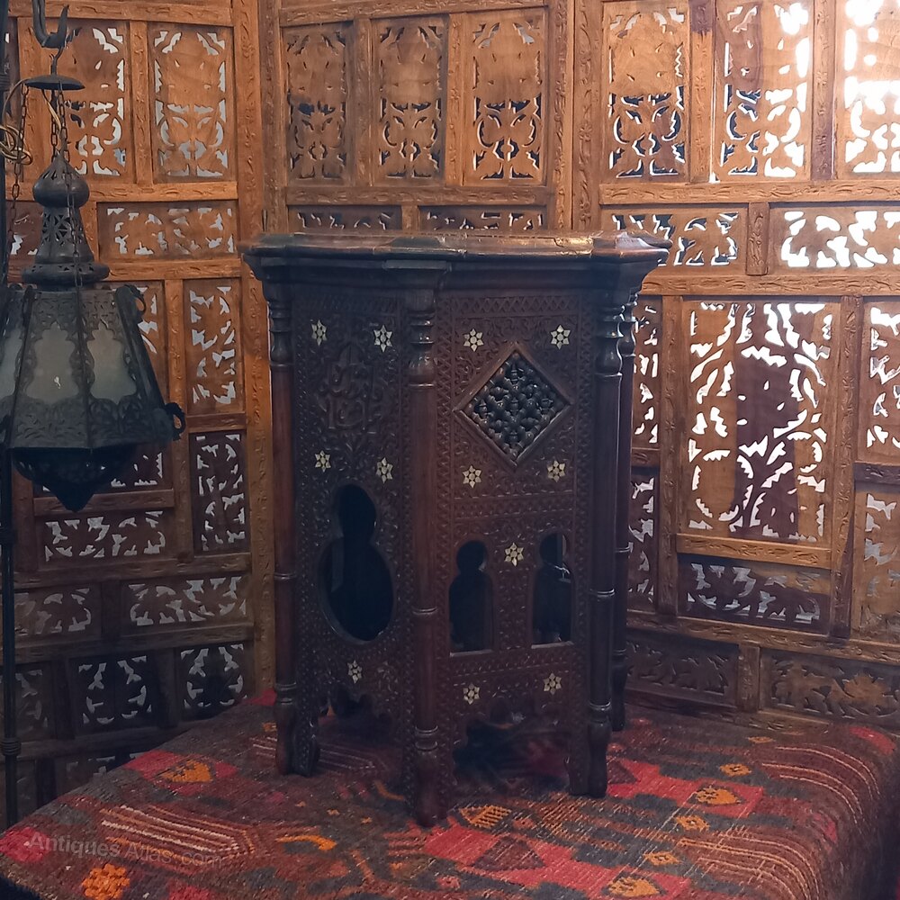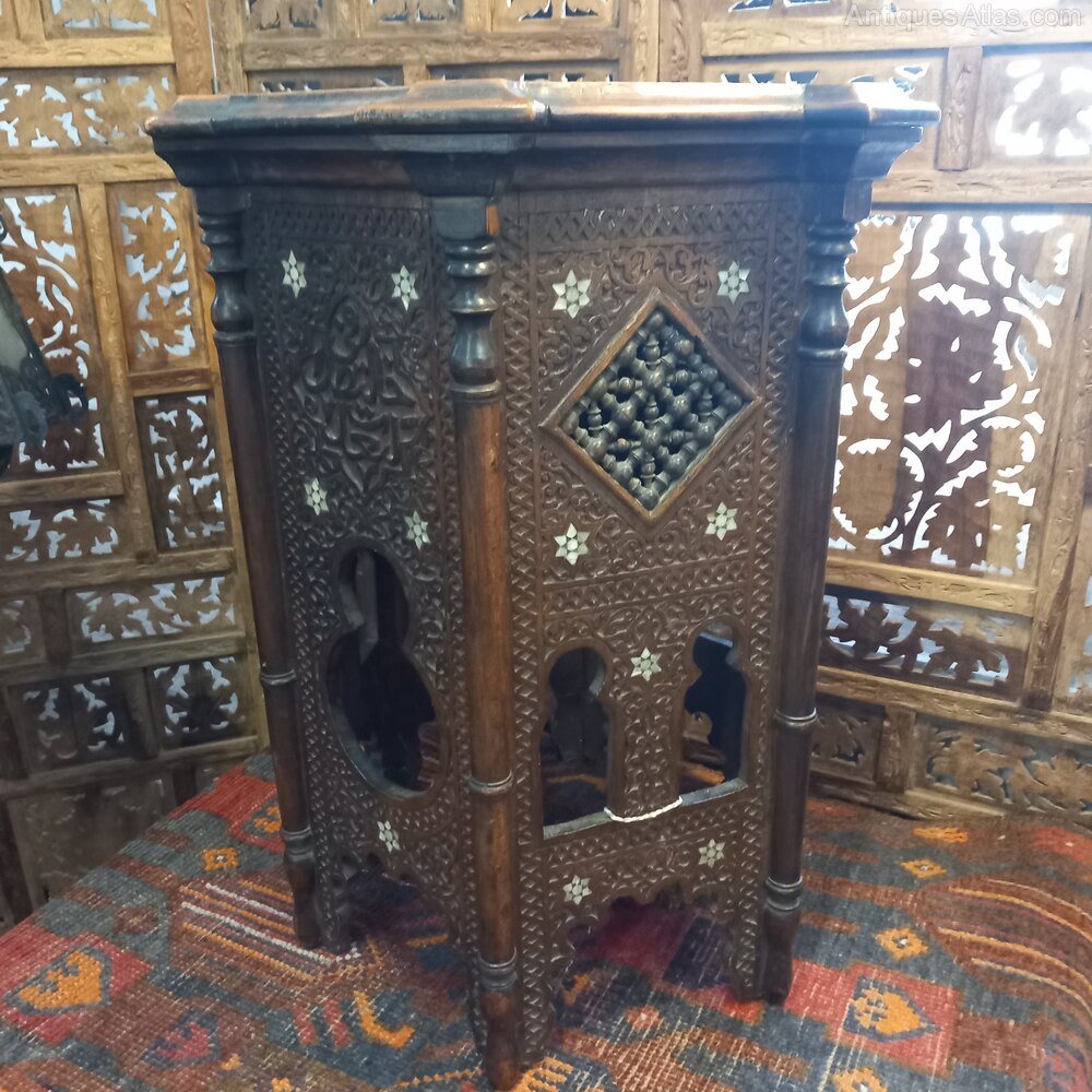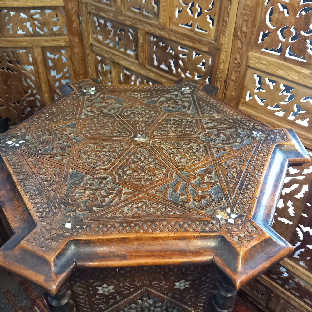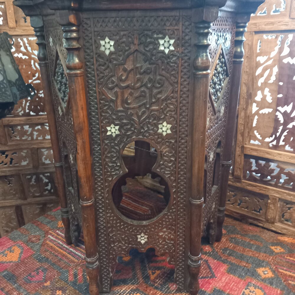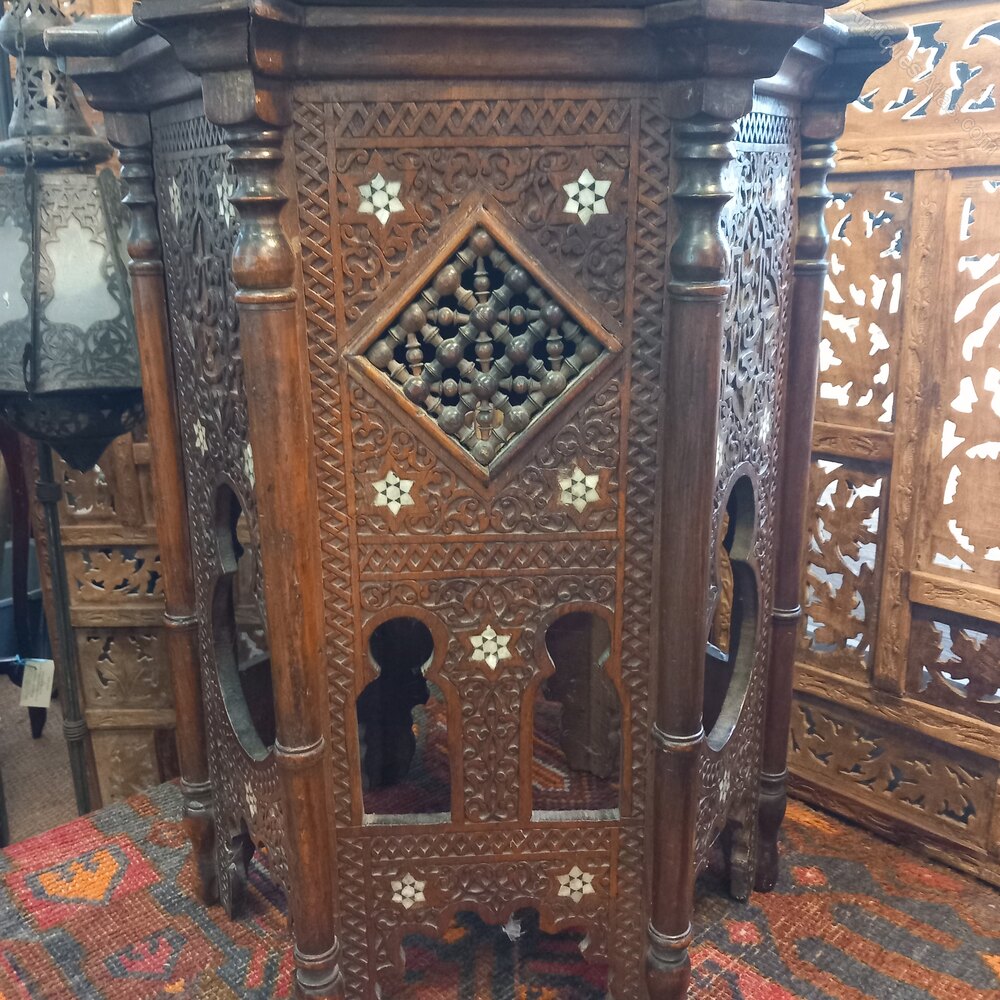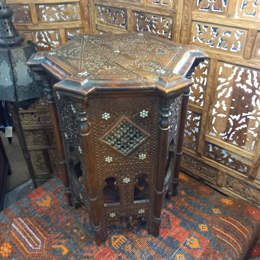This table has inlaid mother of pearl and bone decoration, Islamic script, carved open work side panels and carved wood top.