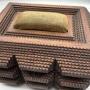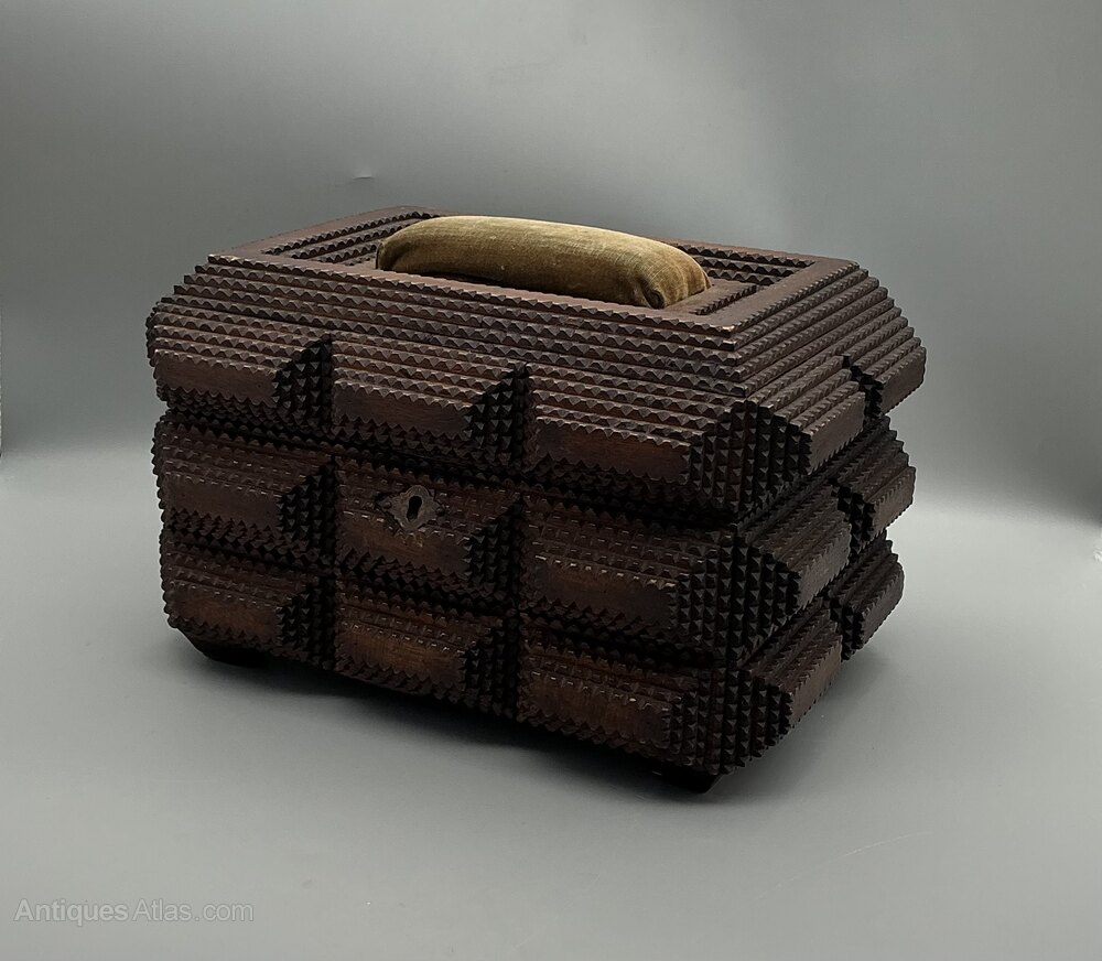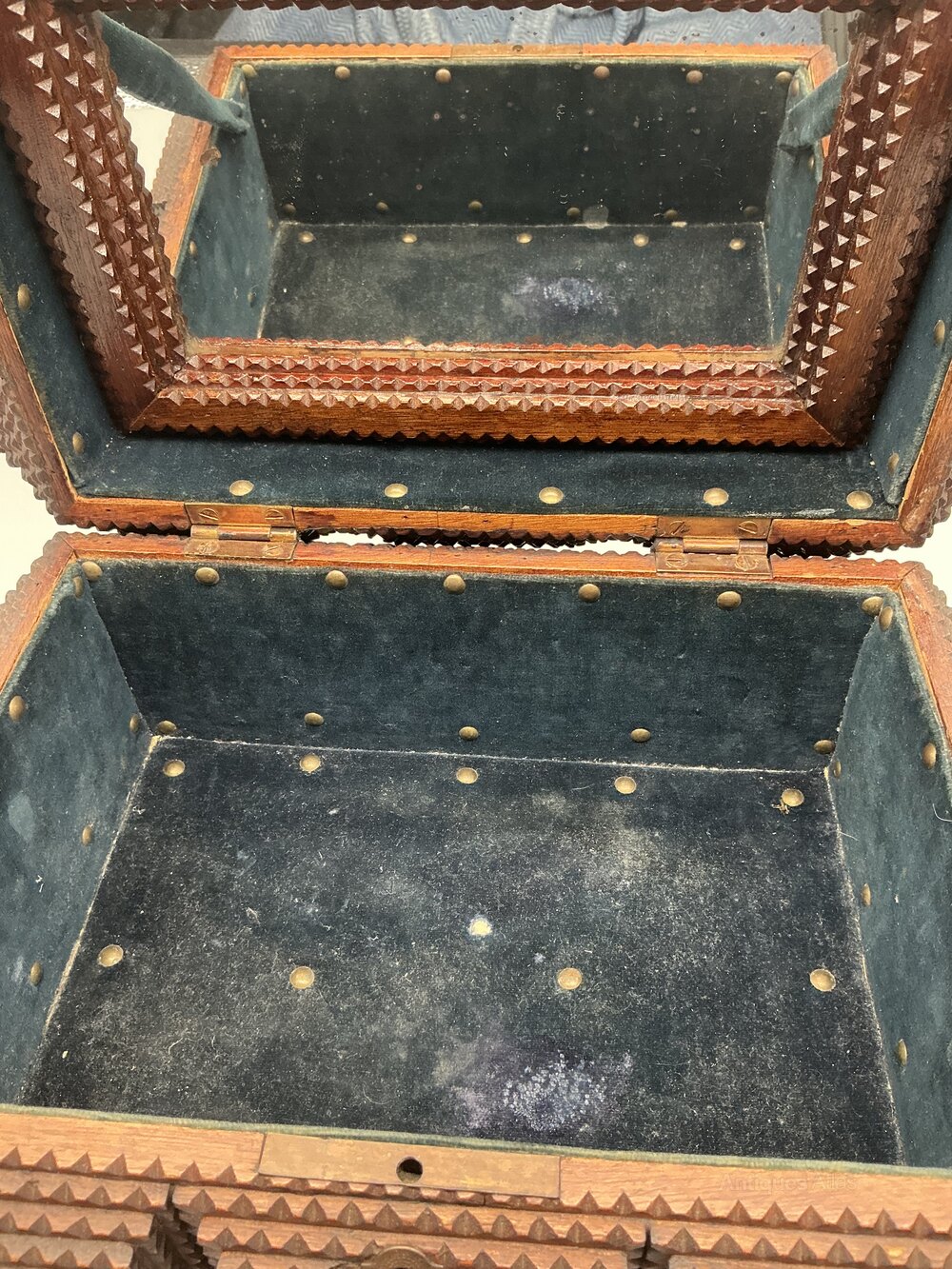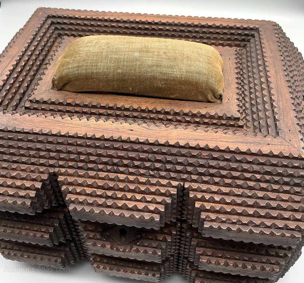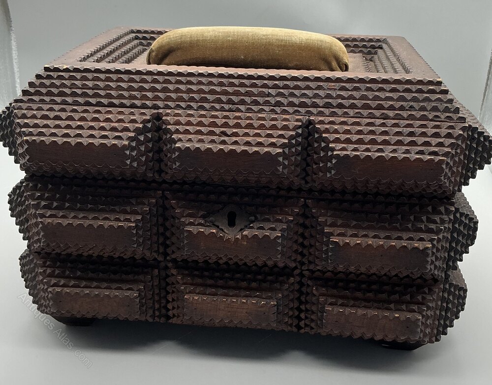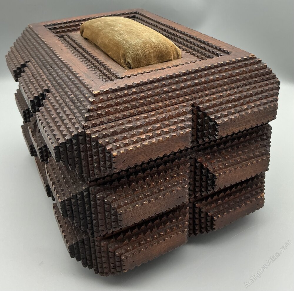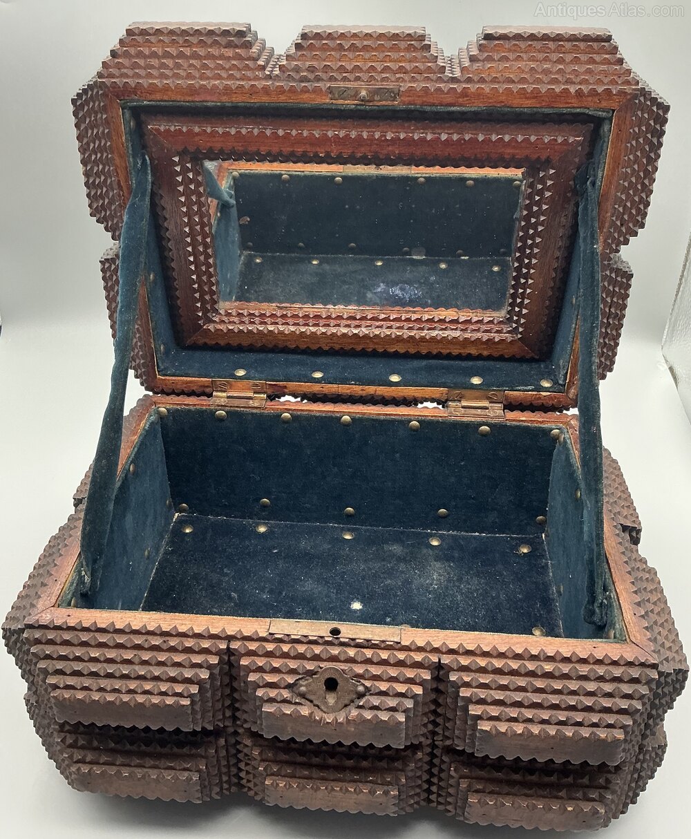 • Exterior: Features stepped and notched carved decoration typical of Tramp Art design, with a central escutcheon/keyhole to the front.