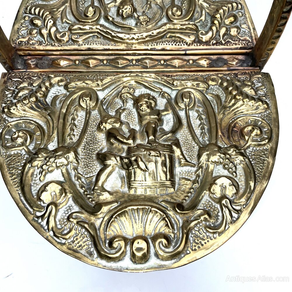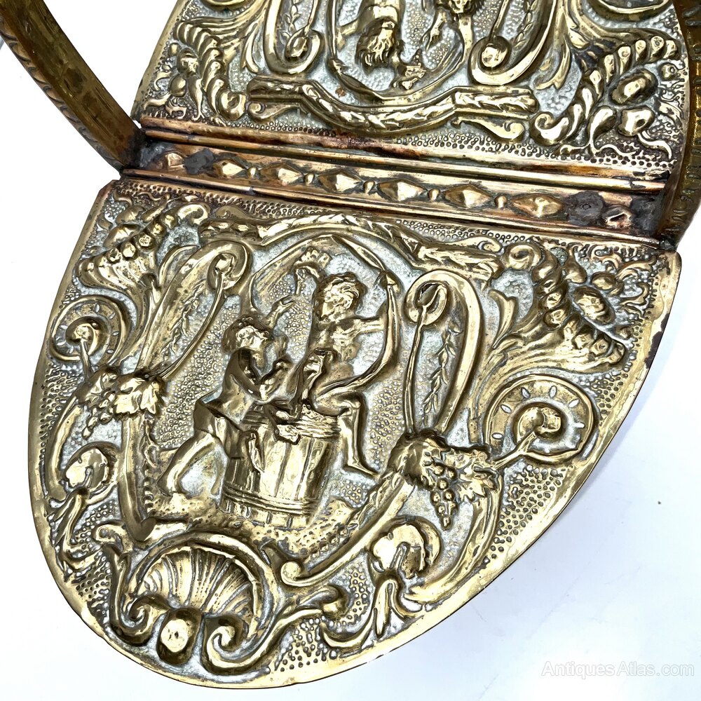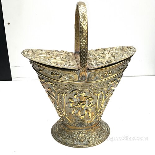 Arts and Crafts Brass Coal Bucket with Tavern Scen