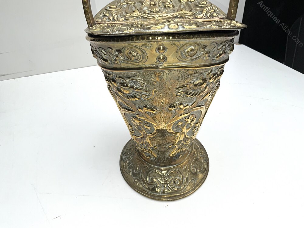 A stunning original Victorian brass coal scuttle bucket with double lids and handle.not perfect as being old has some issues but still solid and both lids hinges good solid strong handle too, standing 53 cm high from floor to top of handle length of 43 cm depth being, 27 cm a very decorative item, offering free UK delivery, reference DBSS Tel: +44 7505 165 843 We accept online payments for all our items listed: Bank transfer cash on collection or if wishing over the phone using your debit or credit cards, also doing layby payments plan, or email giving your address details & contact number and we shall send you your items invoice to make payment with your card. Send your request to - john.strong2@gmail.com