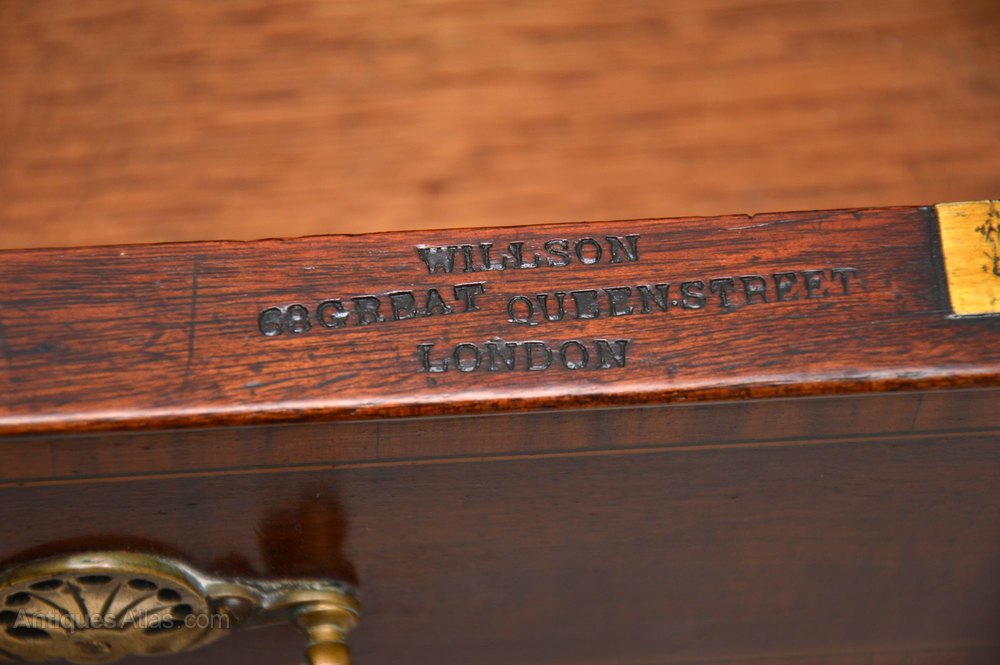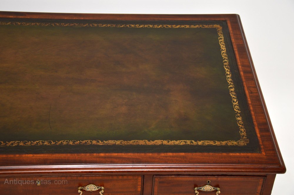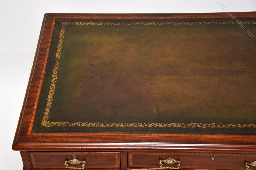 A handsome and extremely fine quality antique mahogany leather top pedestal desk, with satinwood inlaid bandings all over. This dates from around the 1880-1890 period. It bears the makers mark ‘Willson 68 Great Queen Street London’.