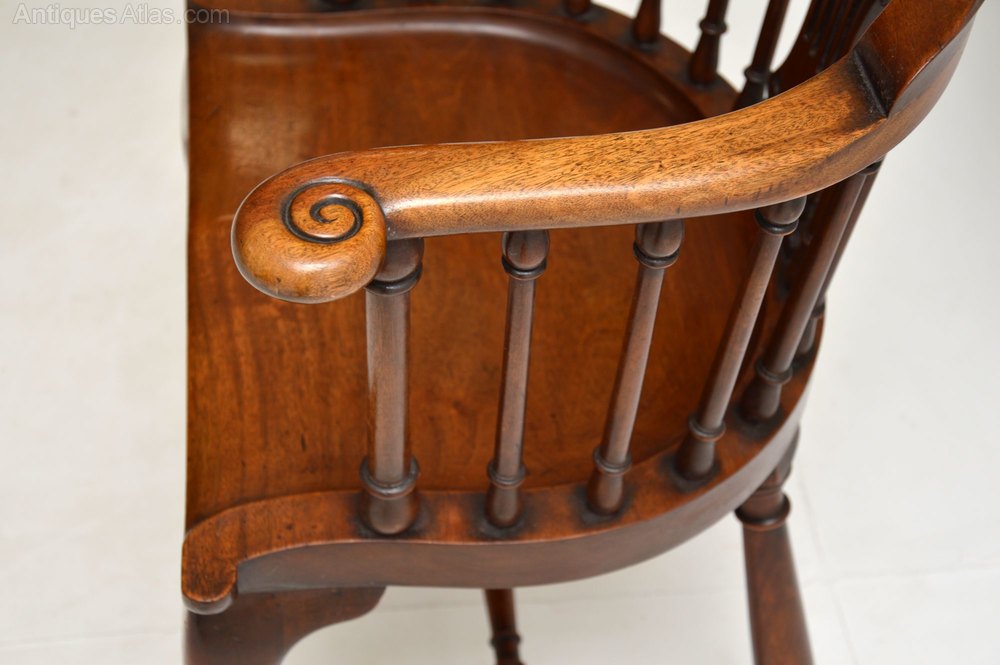This has a fabulous shape and is of amazing quality. There are beautifully swept out scrolled arms, finely turned spindle rails and cabriole legs with H frame stretchers. The seat is nicely moulded, this is very comfortable, sturdy and sound.