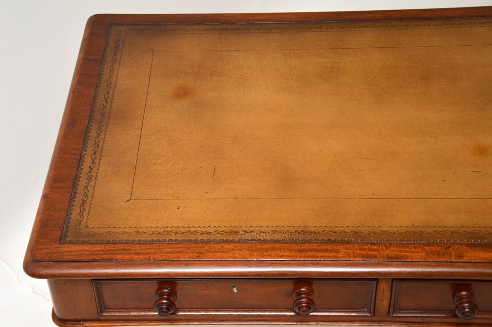 It is of superb quality, with solid mahogany construction throughout. There are beautifully turned handles and legs, the back is also nicely finished so this can be used as a free standing item. The inset greenish brown leather is also of super quality, it is gold tooled and has a stunning patina. The drawers have fine hand cut dovetailed joints, and this sits on lovely original brass casters.