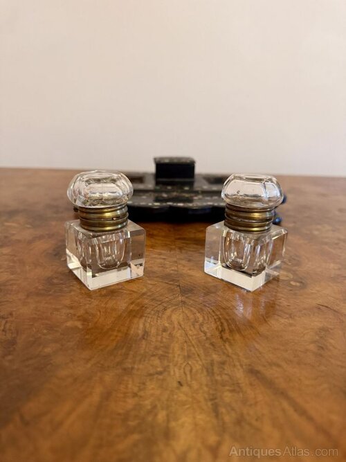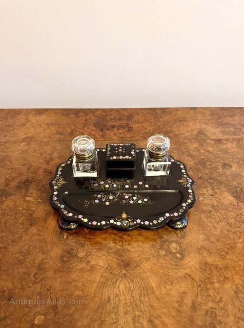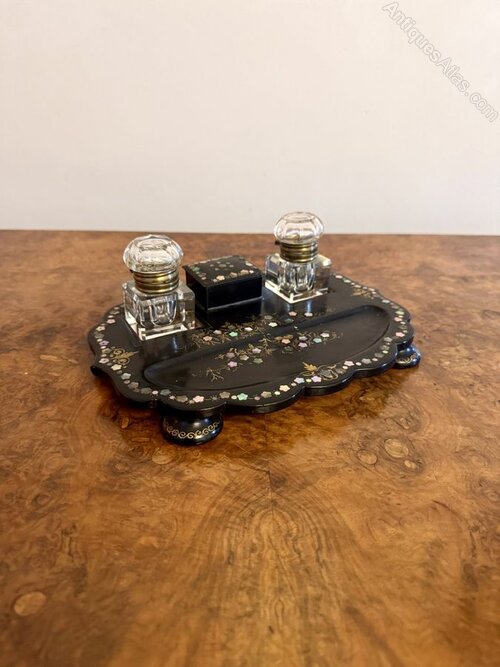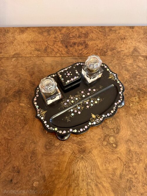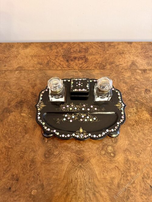 Beautiful quality antique Victorian Papier-Mache Desk Set, having a quality Victorian papier-mache desk set inlaid with stunning mother of pearl detail with a shaped edge raised on four decorative bun feet, having the original pair of glass ink wells storage pot and pen tray.