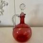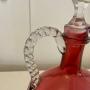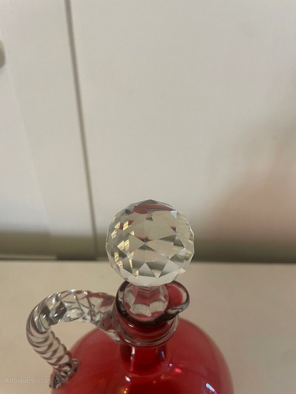 Antique Victorian quality cranberry glass decanter having an unusual rope twist glass handle and original stopper