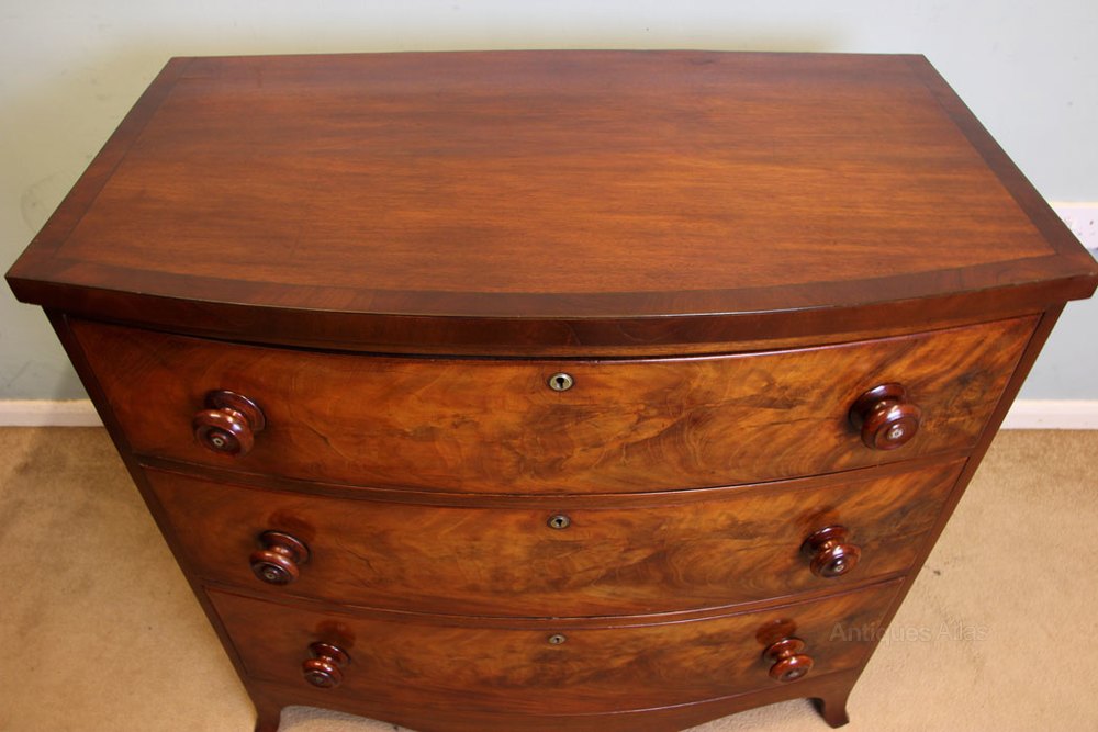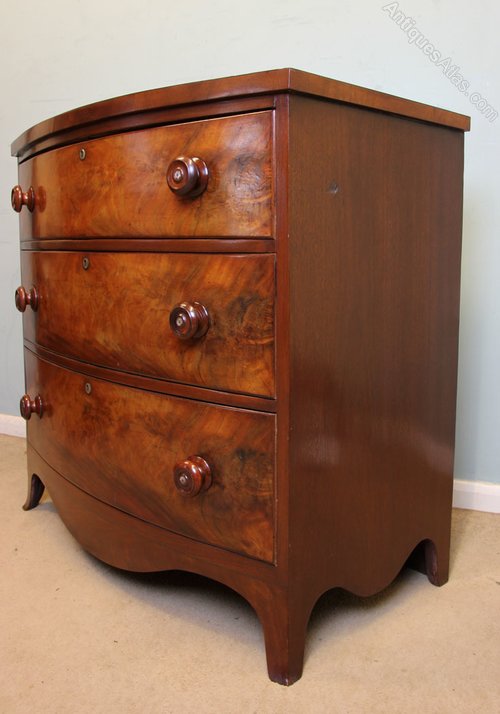 Antique 19th century bow front chest of drawers, This Victorian mahogany bow front chest of drawers has a mahogany cross banded top with three lovely figured mahogany bow fronted drawers under each fitted with turned wooden handles the chest is supported with shaped bracket feet. Circa 1850