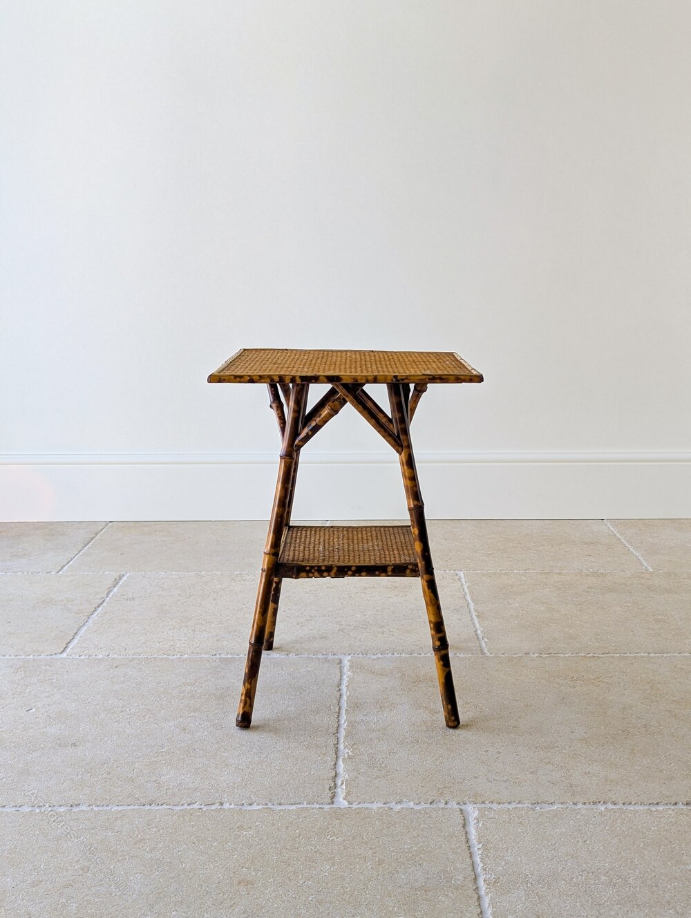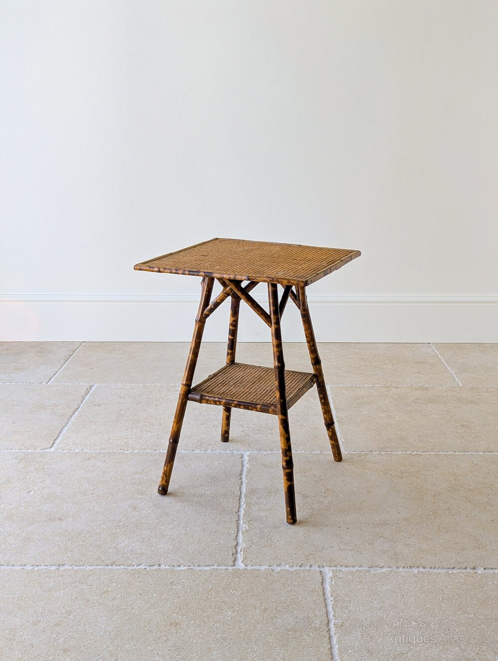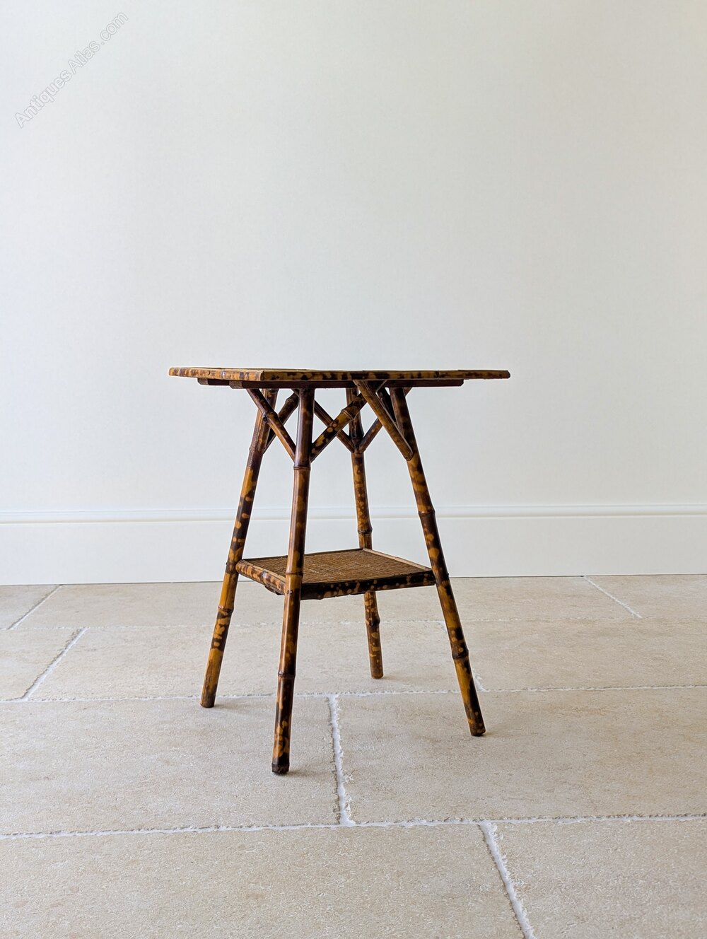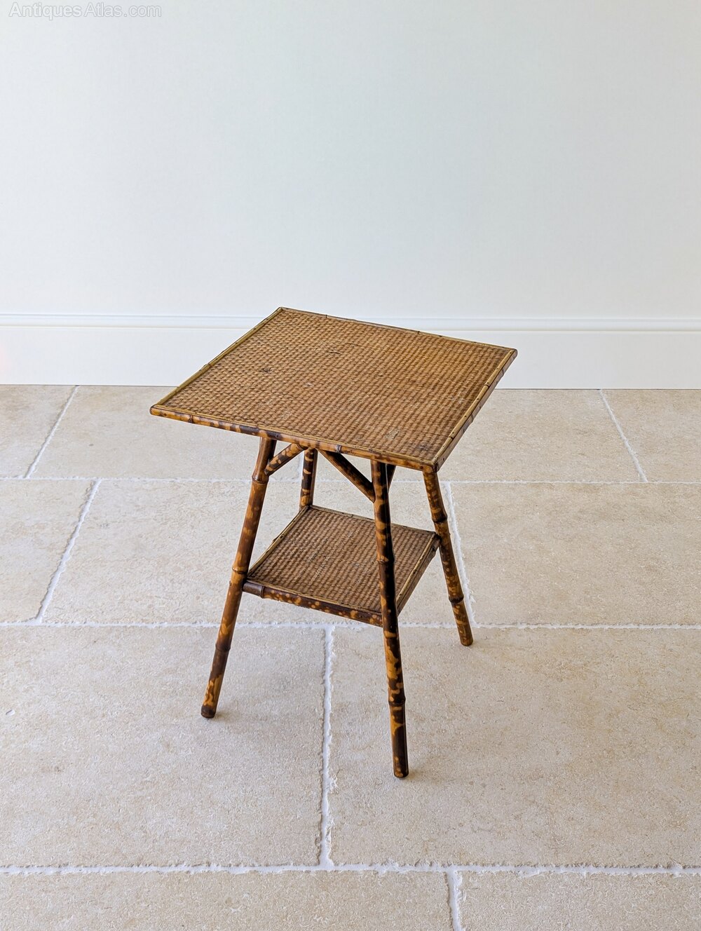 A simple, understated late Victorian tiger bamboo occasional table of square form raised on gently splayed legs united by a lower tier and reinforced with typical decorative cross braces below the tabletop. Wonderfully original with excellent colour, showcasing the fashionable Aesthetic Movement’s Anglo-Japanese influence of the period.