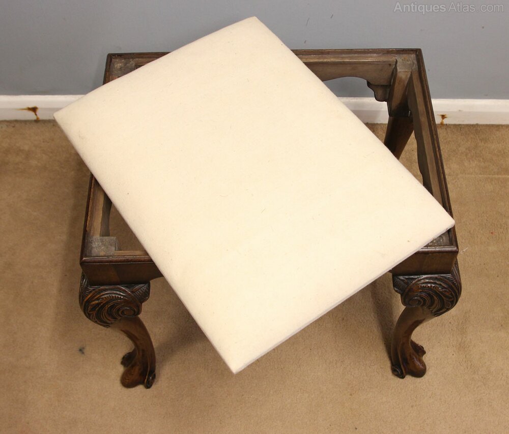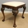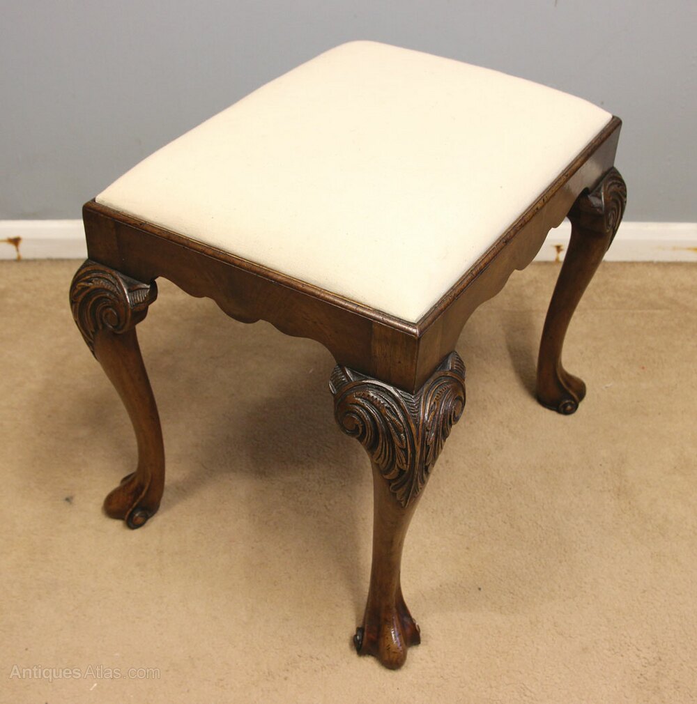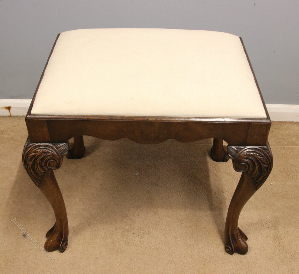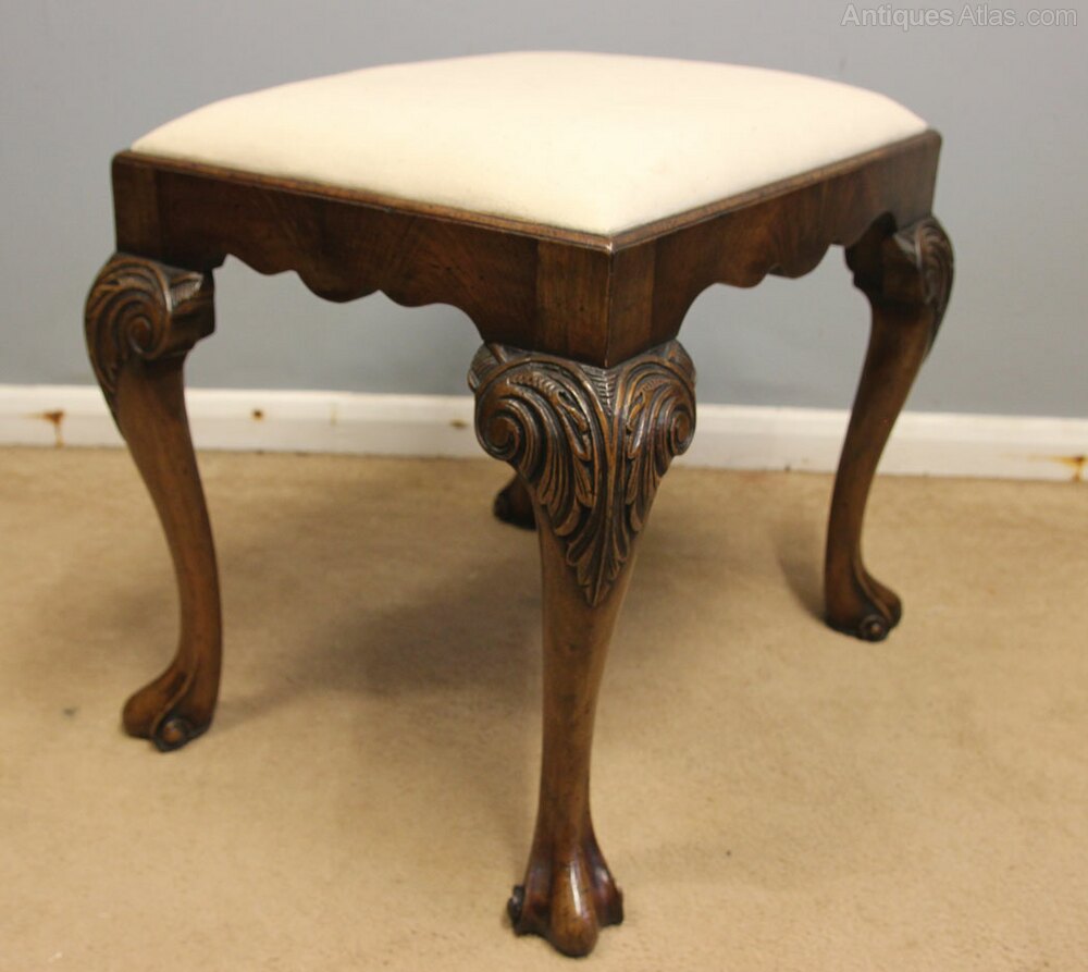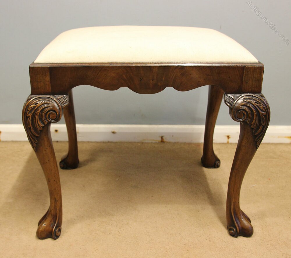 Antique Walnut Dressing Table Stool, This antique walnut queen anne style stool has well carved knees to the cabriole legs with scroll carved feet. The seat pad lifts out,