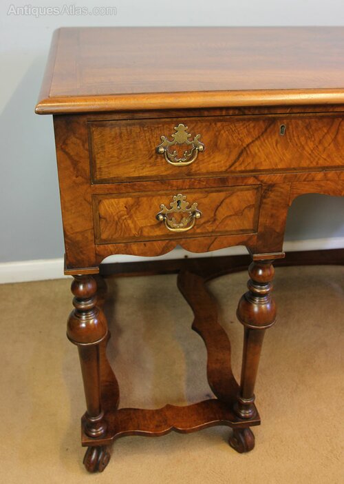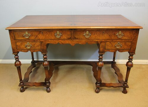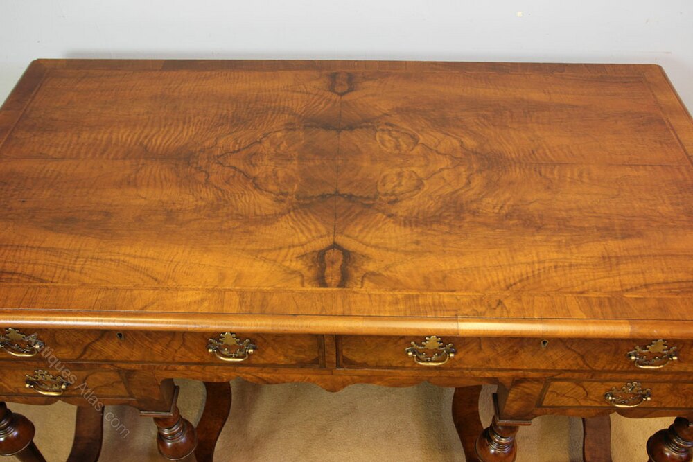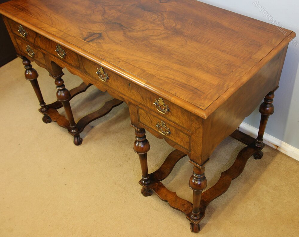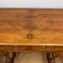 Antique Walnut Side Table Writing Desk, This antique figured walnut Writing Desk / Side Table, Dressing Table, has a lovely walnut top with herring bone and cross banded edge having two long drawers and two short drawers all made in solid oak, The desk is all supported by turned legs united by shaped stretchers and scroll shaped feet,