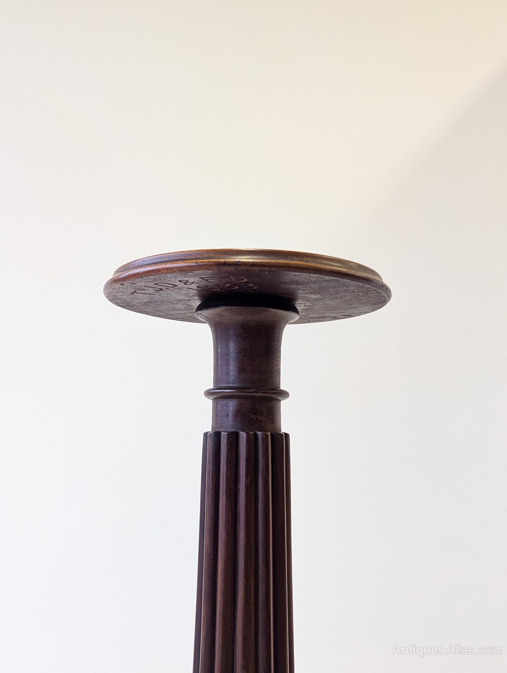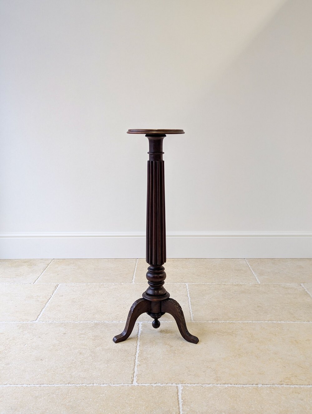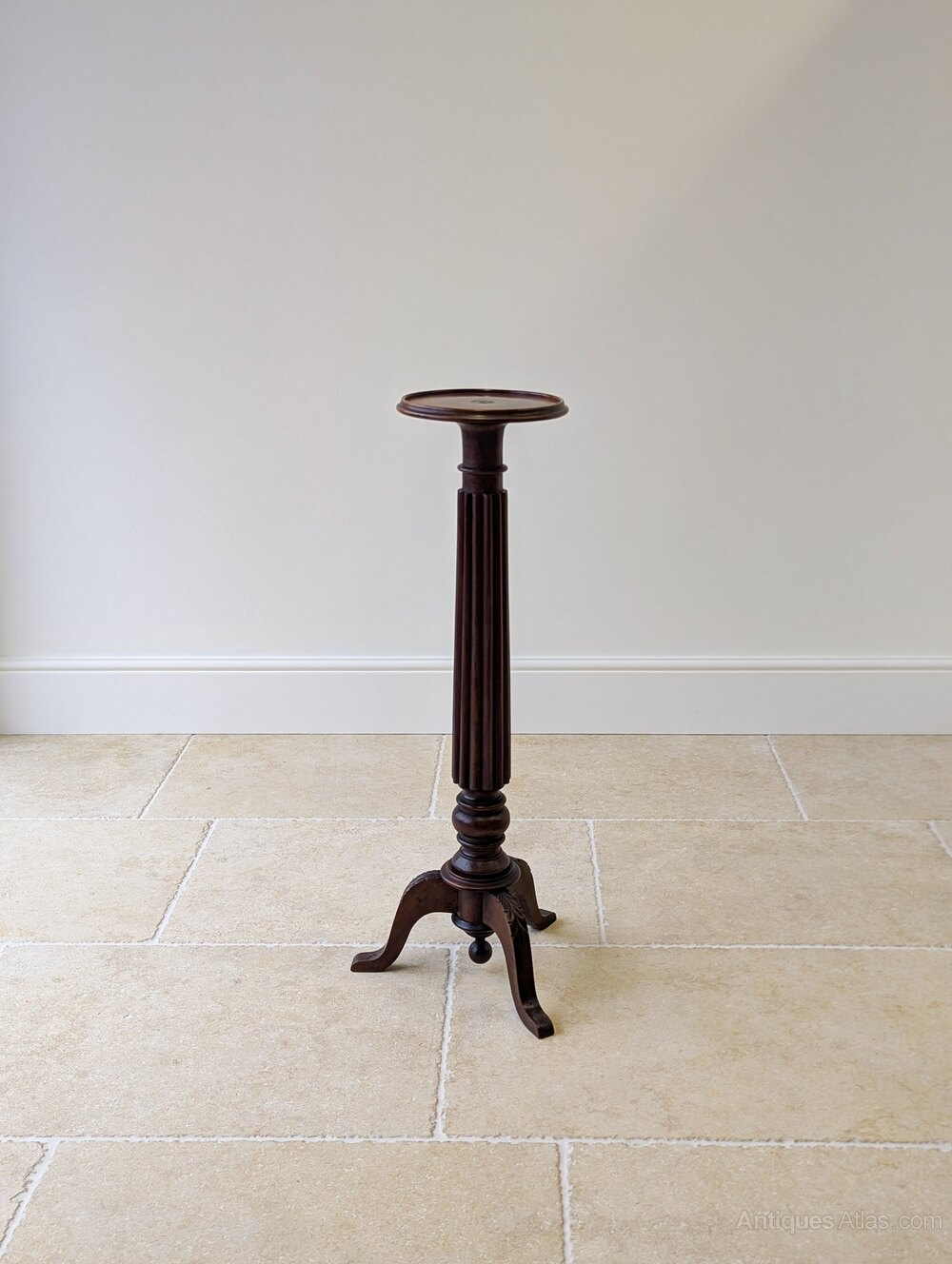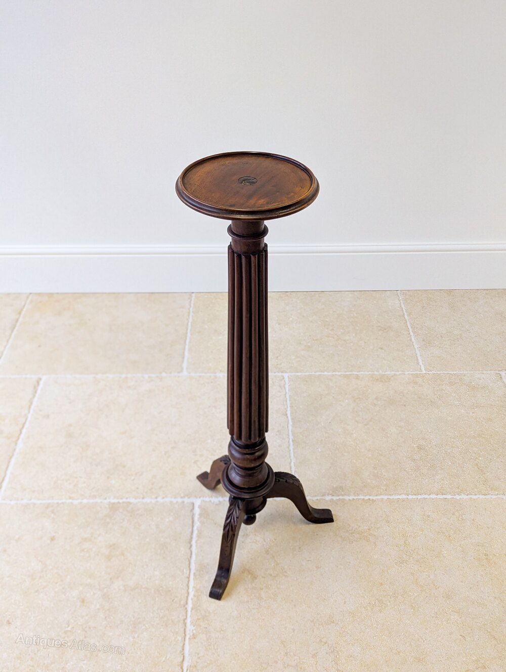 A William IV mahogany torchere with the circular candle plate raised on a fluted column above a tripod base with incised decoration to the feet and a central turned pendant finial.