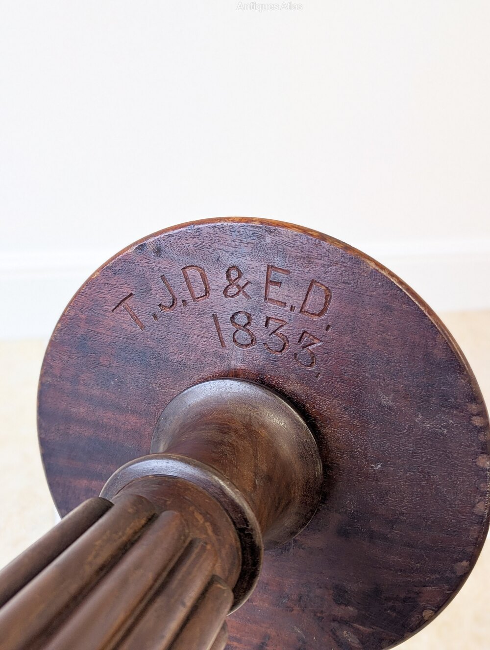 The underside of the candle plate bears a hand-carved inscription dated 1833, aligning closely with the form and decorative language of the stand.