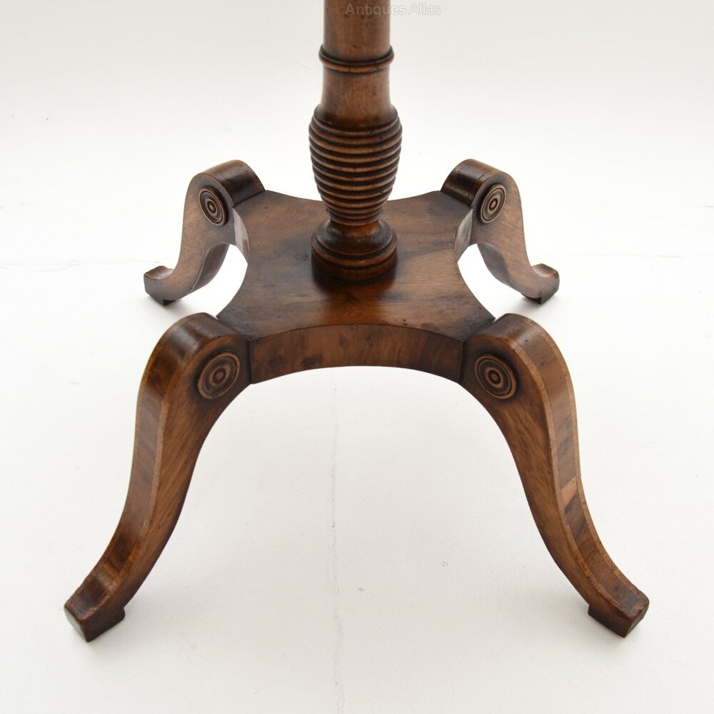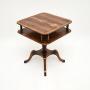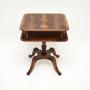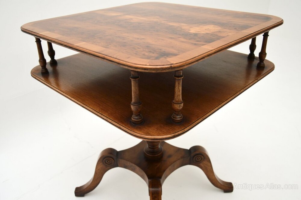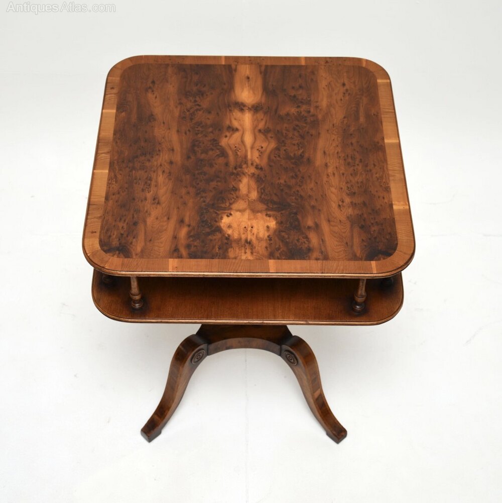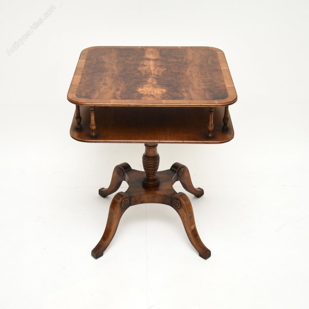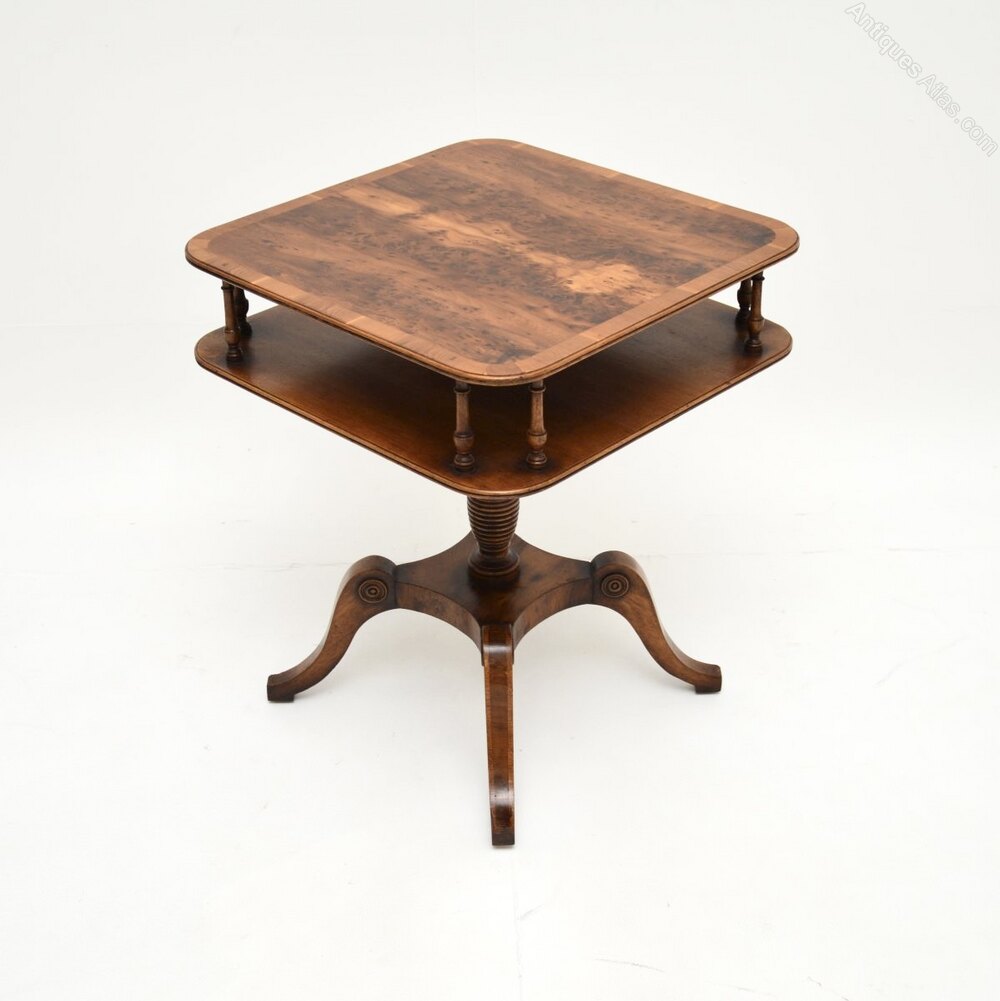 It is of superb quality, the square top has rounded edges and a useful lower tier, connected by beautifully turned supports. The top has a cross banded edge and stunning grain patterns. This stands on a elegant yet sturdy platform base with sabre shaped legs.