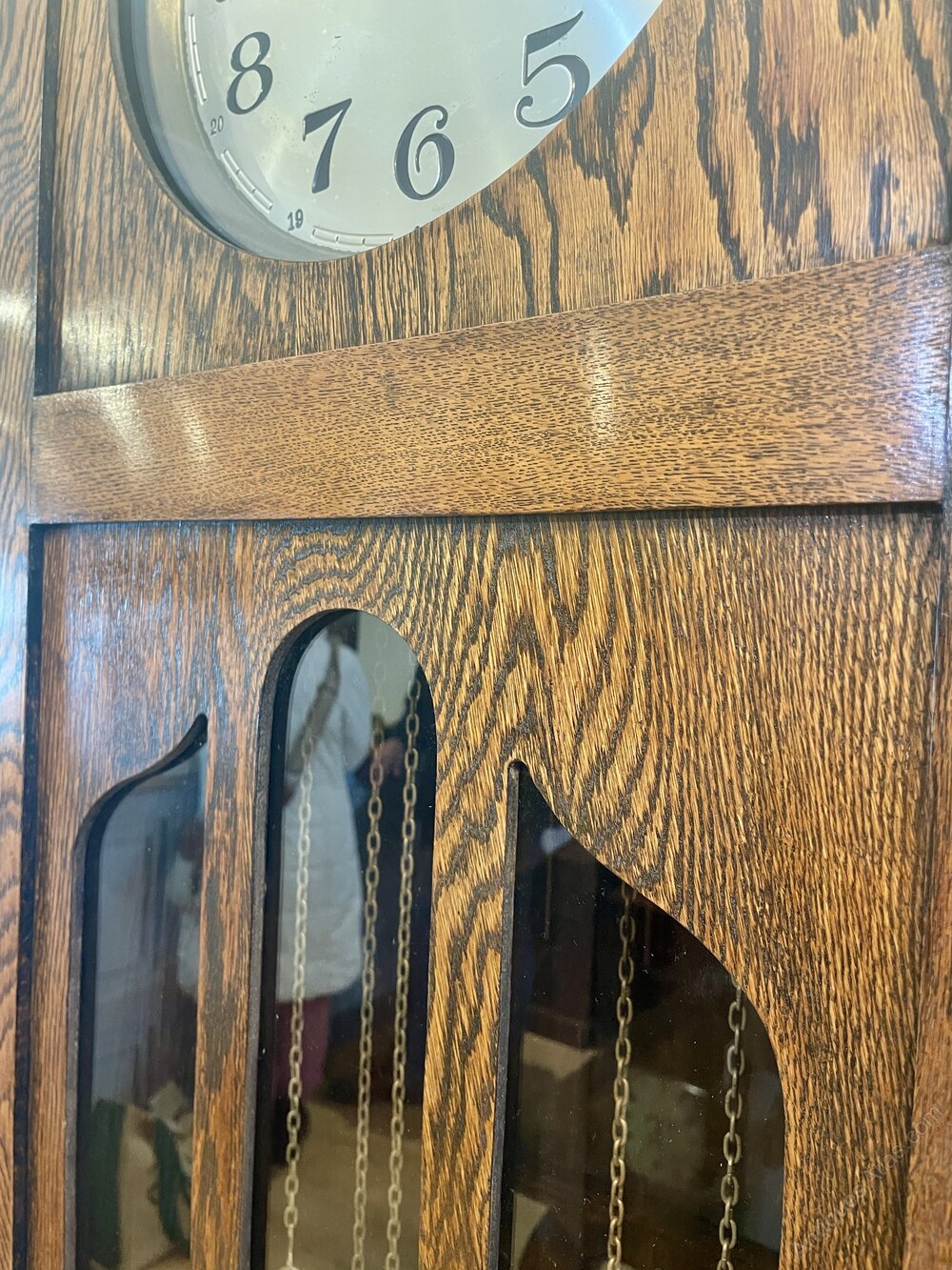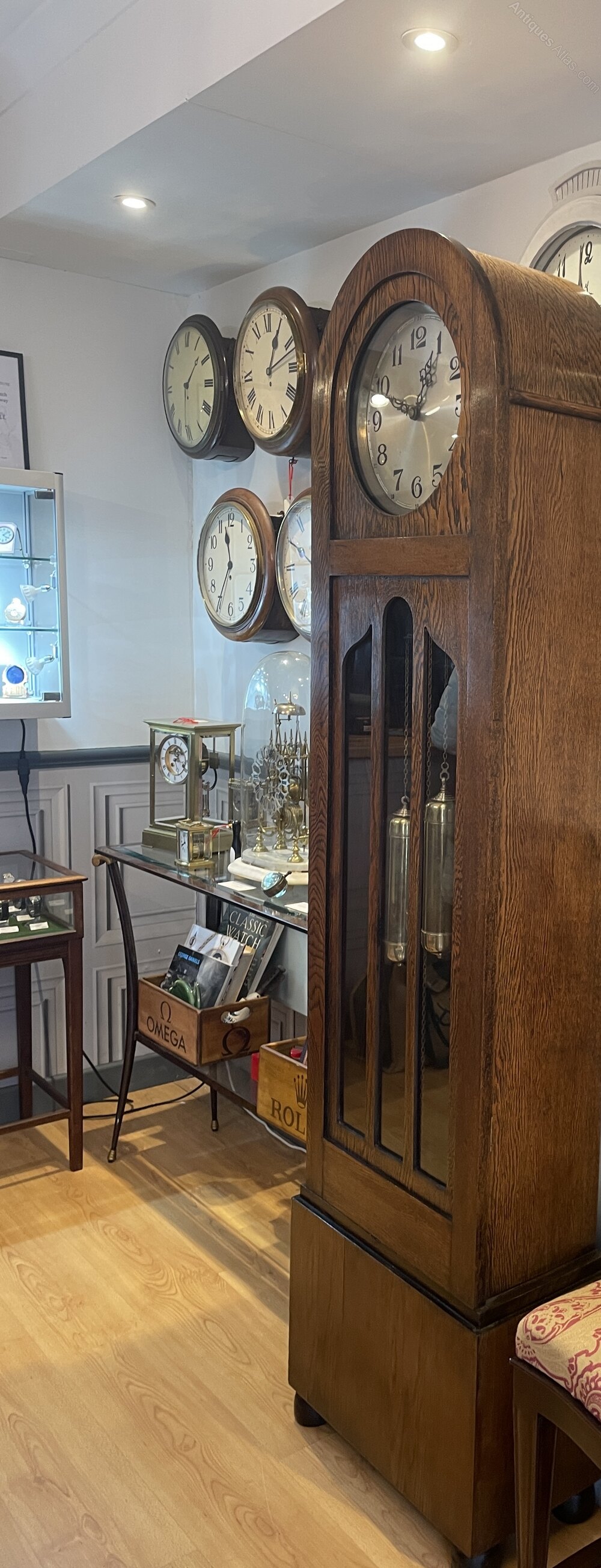 Art Deco 1930s longcase clock with chiming movement with three weights and pendulum in oak case