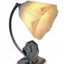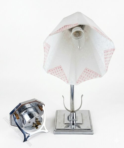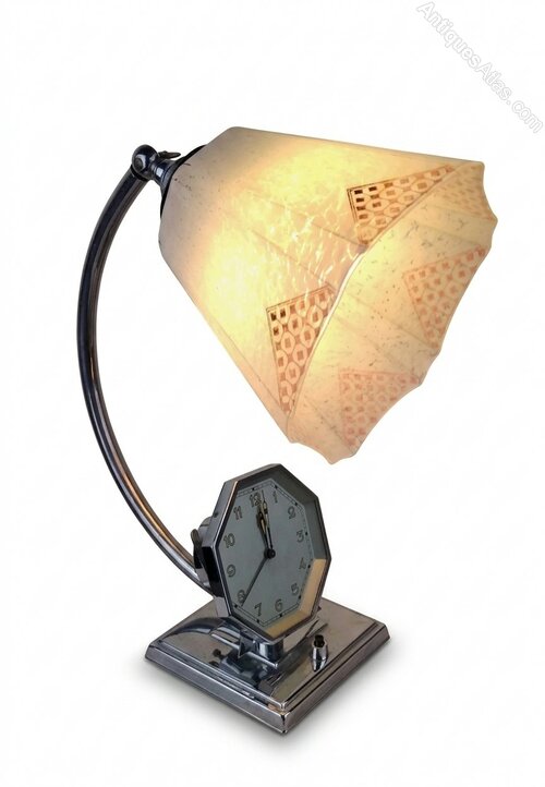 Unusual art deco bedside tablelamp in chrome with removeable , integral alarm clock and original , adjustable glass shade with stylised geometric decoration . Good original condition , the clock is a 30 hr movement although in reality more 24 hrs , in either case would require winding every day as would the alarm . The lamp has been rewired with silk cord , PAT tested with certificate and is ready to plug in .