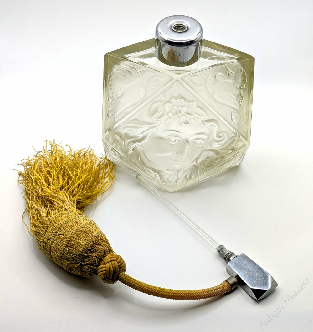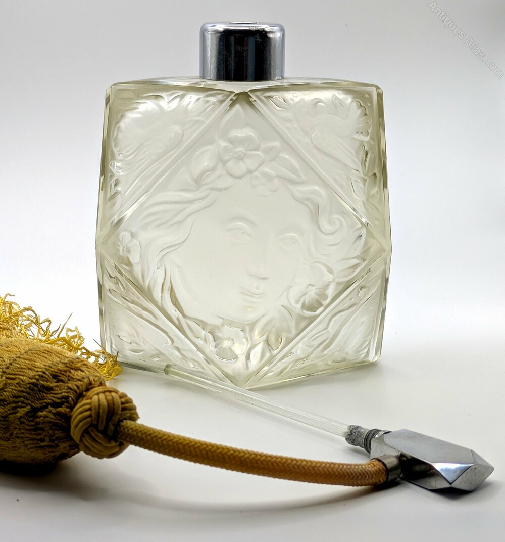 For your consideration is this fabulous Art Deco ladies perfume bottle, intricately detailed facet-cut glass with an embossed female face with stylised background, manufactured in Czech republic - the main producer of art crystal: delicate crystal figures, small bottles and vases . The maker of this bottle was Zelezny Brod glassworks and designed by Rudolf Hlousek. This bottle a classic Art Deco, good large size, great condition just one tiny tiny nic to one corner.