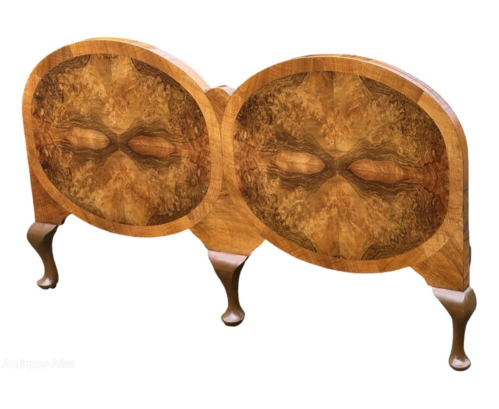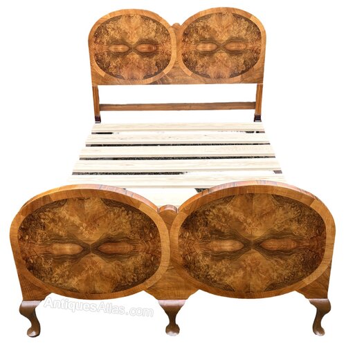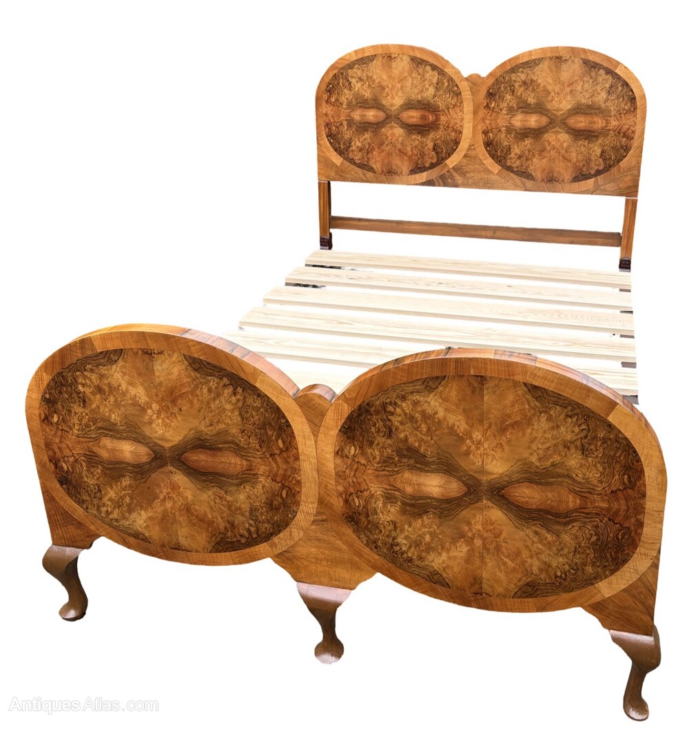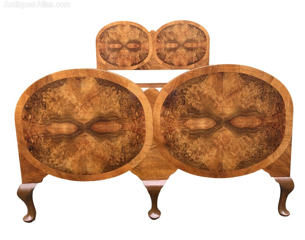 Absolutely spectacular Art Deco Double Bed. Raised on cabriole legs this bed is a rare and wonderful example of Art Deco elegance. The headboard and footboard feature 2 ovals of highly veneered burr walnut surrounded by a wide ring of pale mahogany banding. The depth of colour is wonderful, deep and rich, just like a newly opened conker. Having passed through our workshop this bed is presented in excellent condition. The bed has its original metal vono frame which fits together easily to provide a firm support. We provide slats for the base so all you need is to pop a mattress on top and you are ready to go.