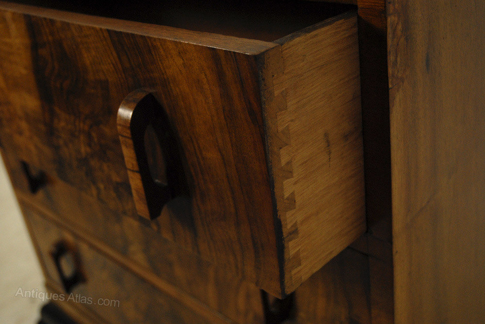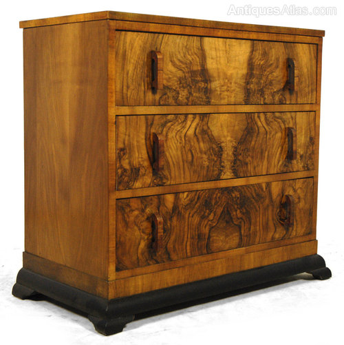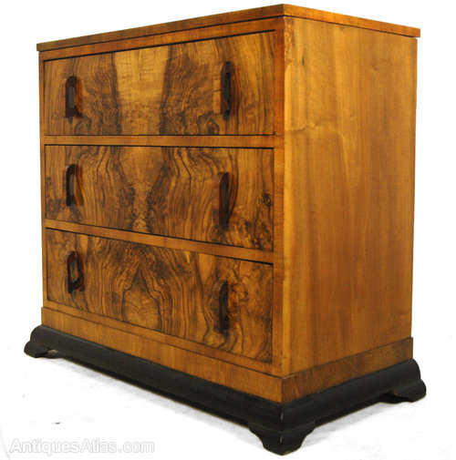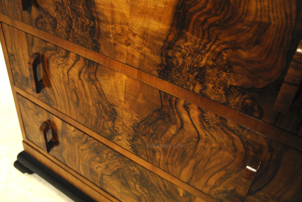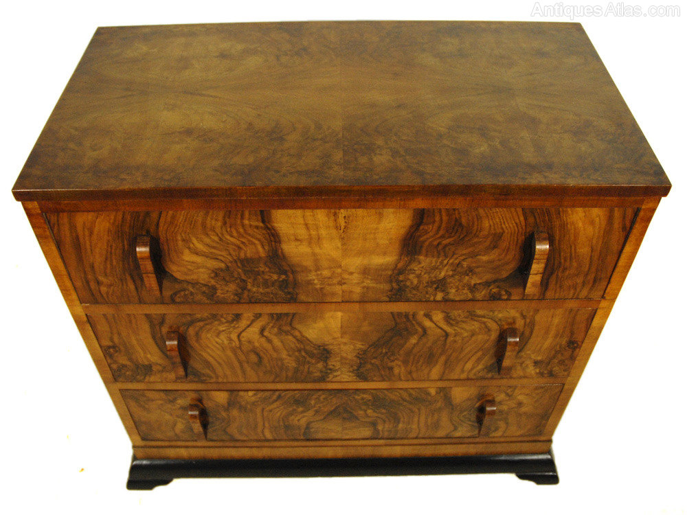 A Lovely little Art Deco three drawer chest in figured walnut, with solid wooden handles this piece of Art Deco Bedroom antique furniture was produced between the 1920's and 1930's.