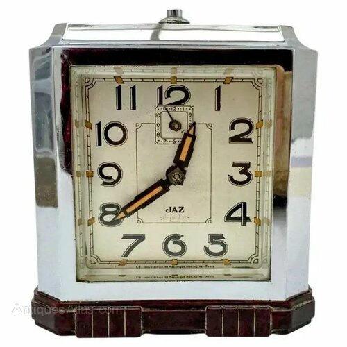 Superb 1930s Art Deco chrome and Bakelite clock made by the Jaz company. This clock is in remarkably good condition. Often these clocks are found with severe chrome tarnishing or pitting but this beauty seems to have stood the test of time ( pun intended!) and is gleaming! The dial also shows little to no signs of it's true age which is also quite unusual for these clocks. Fully working order, having been serviced by our horologist will serve the new owner well.