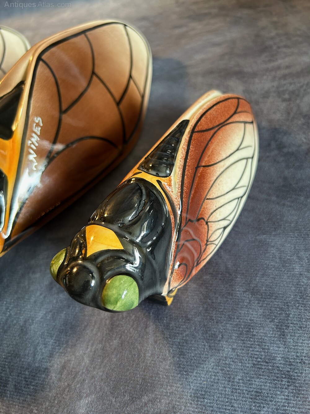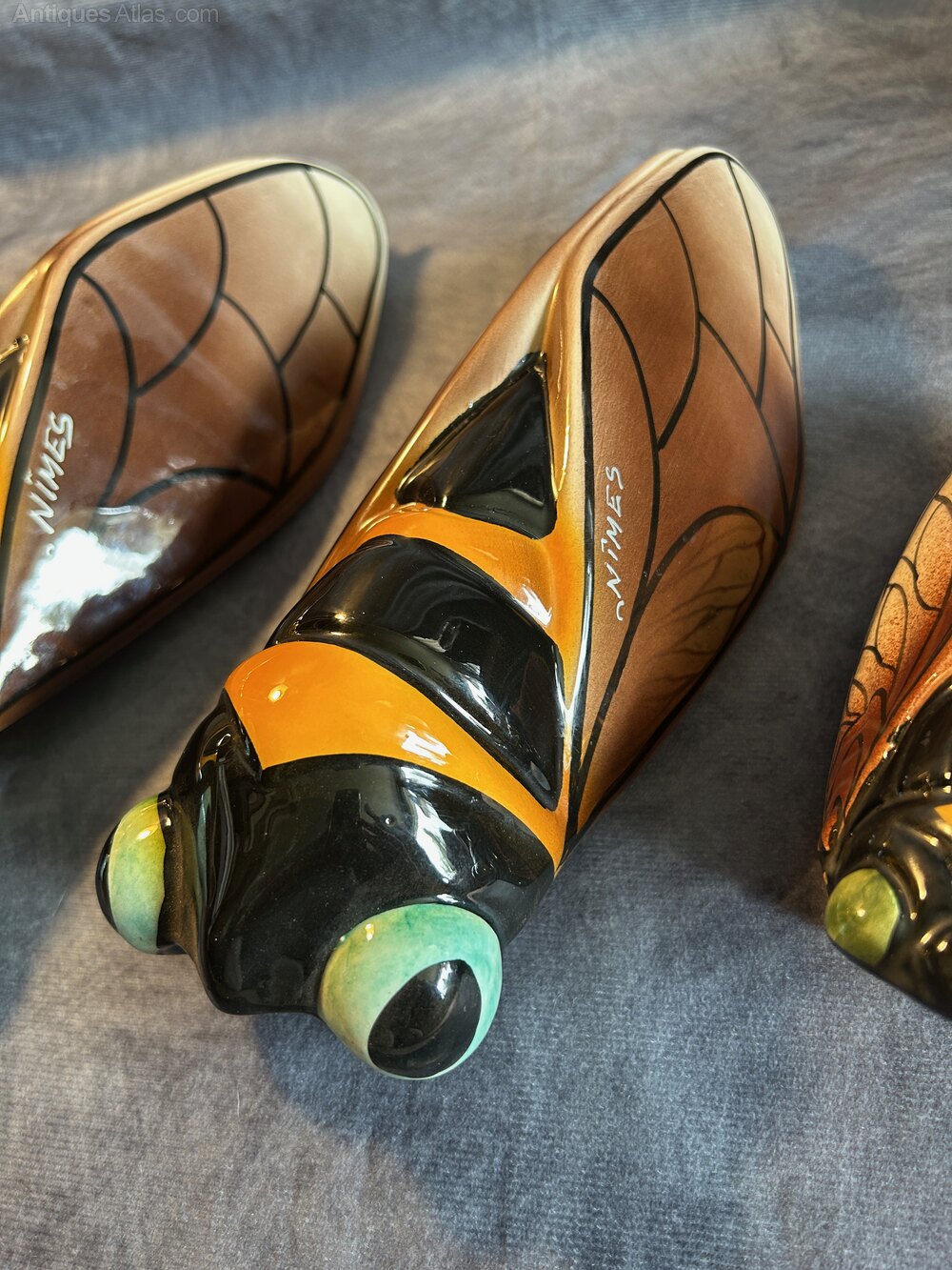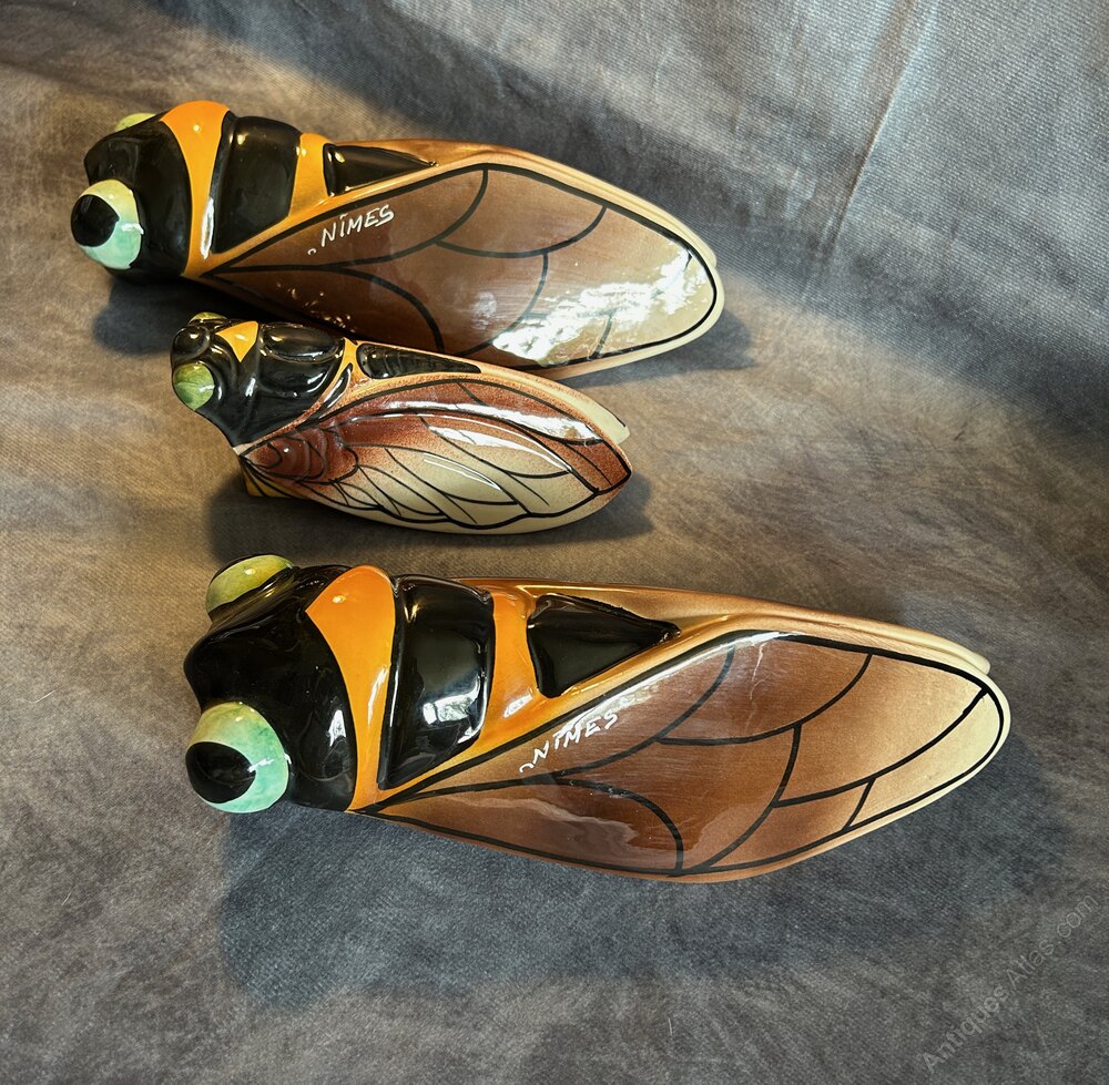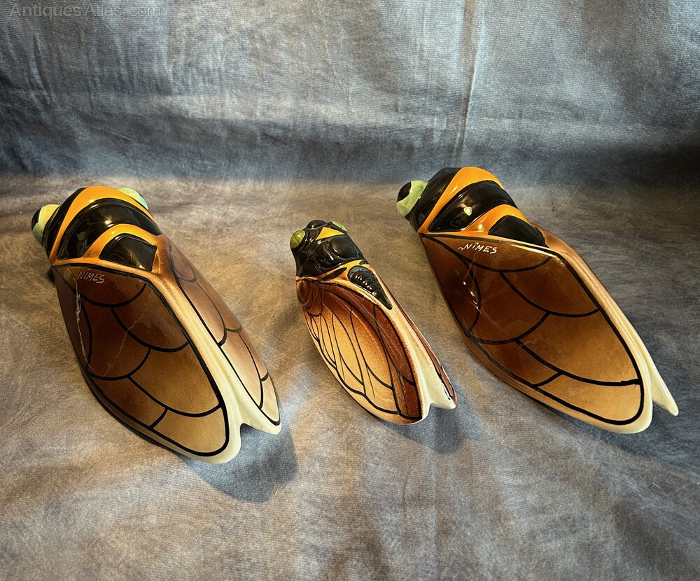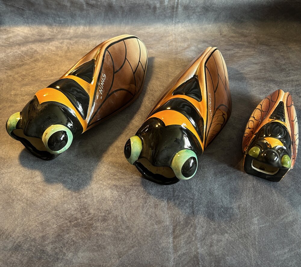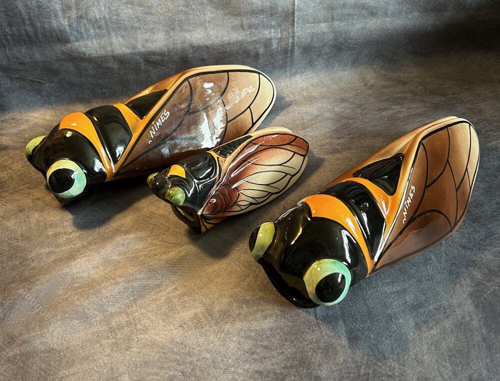 Art Deco French Majolica Cicada Wall Pocket Vases signed Nimes. The cicada, or "cigale" in French, has become a well-known symbol of Provence, representing the region's warm, sunny climate and relaxed lifestyle. Hand-decorated, giving each piece a unique touch.
