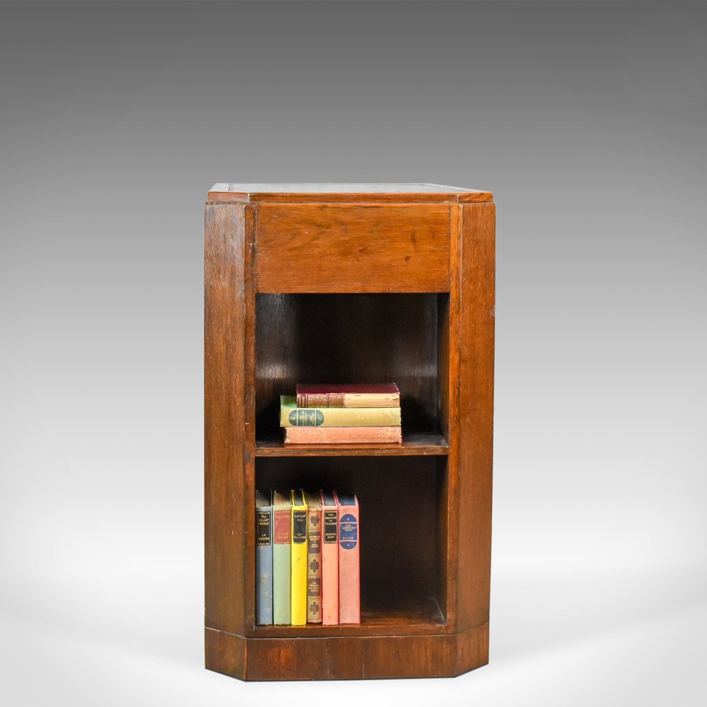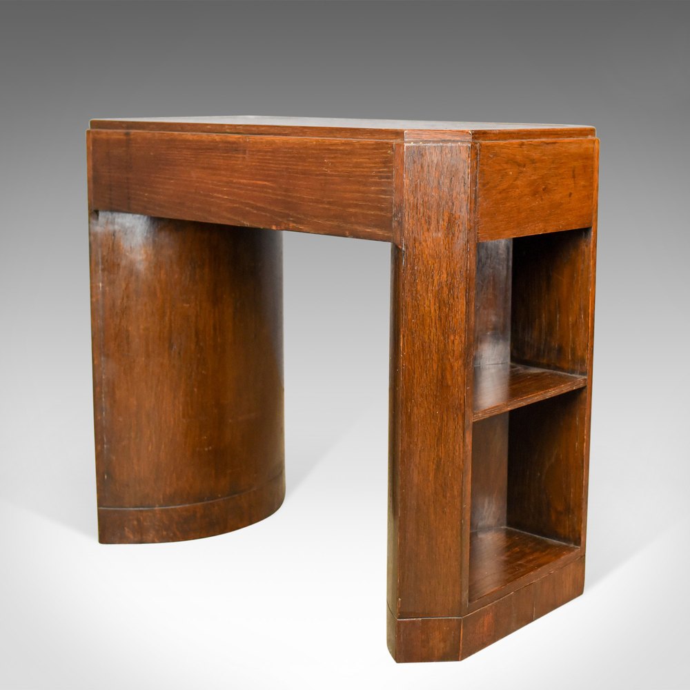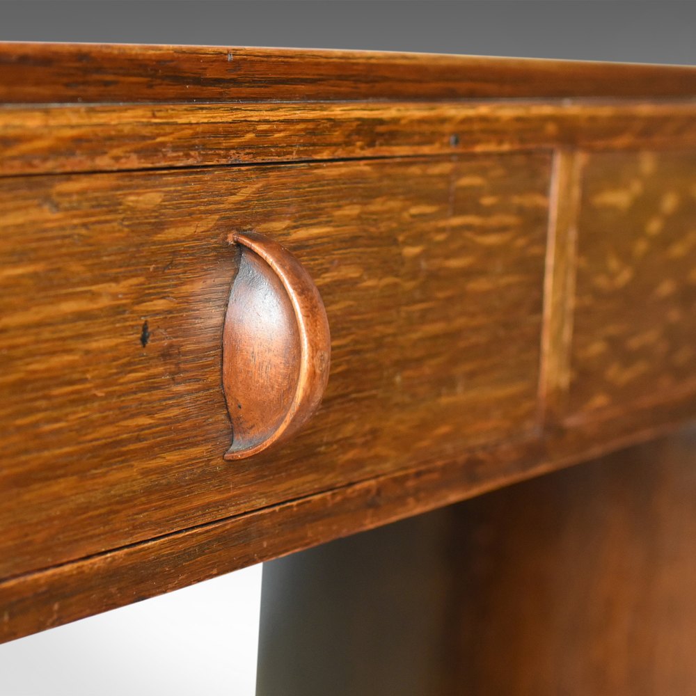 This is an Art Deco kneehole writing desk in English oak with leather skiver dating to circa 1930.