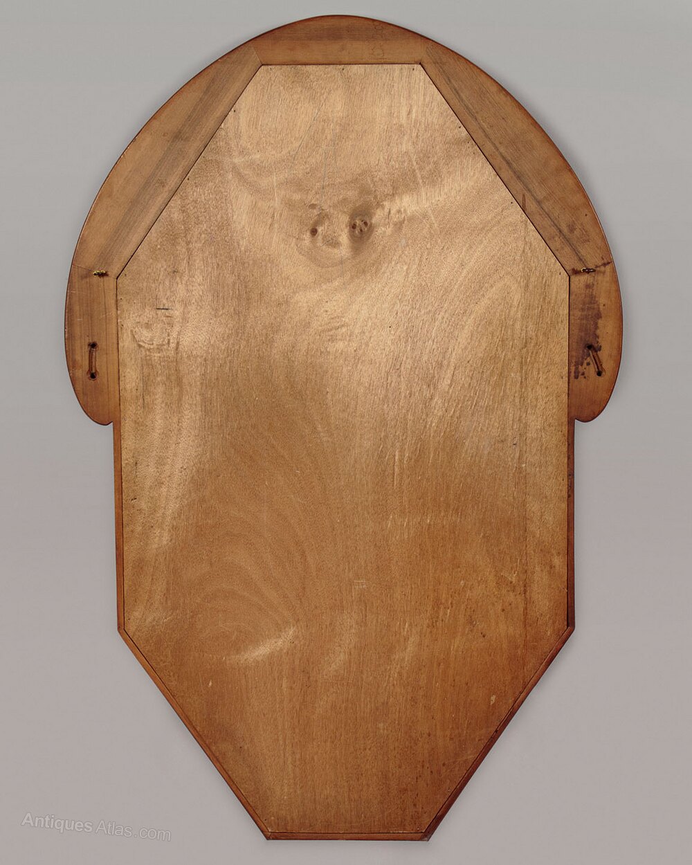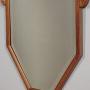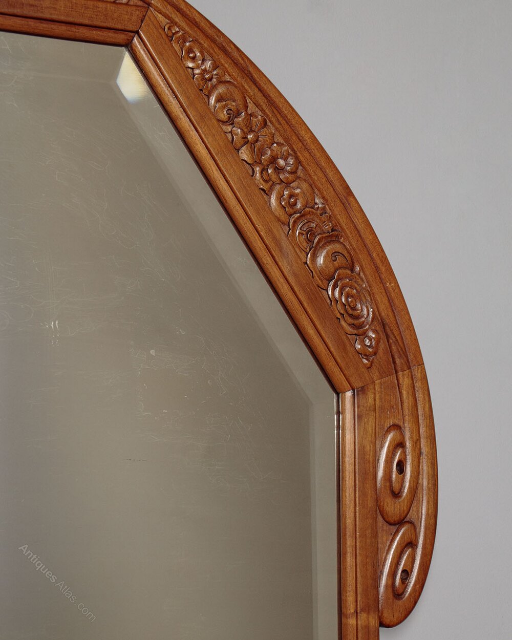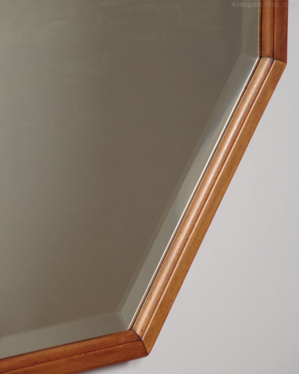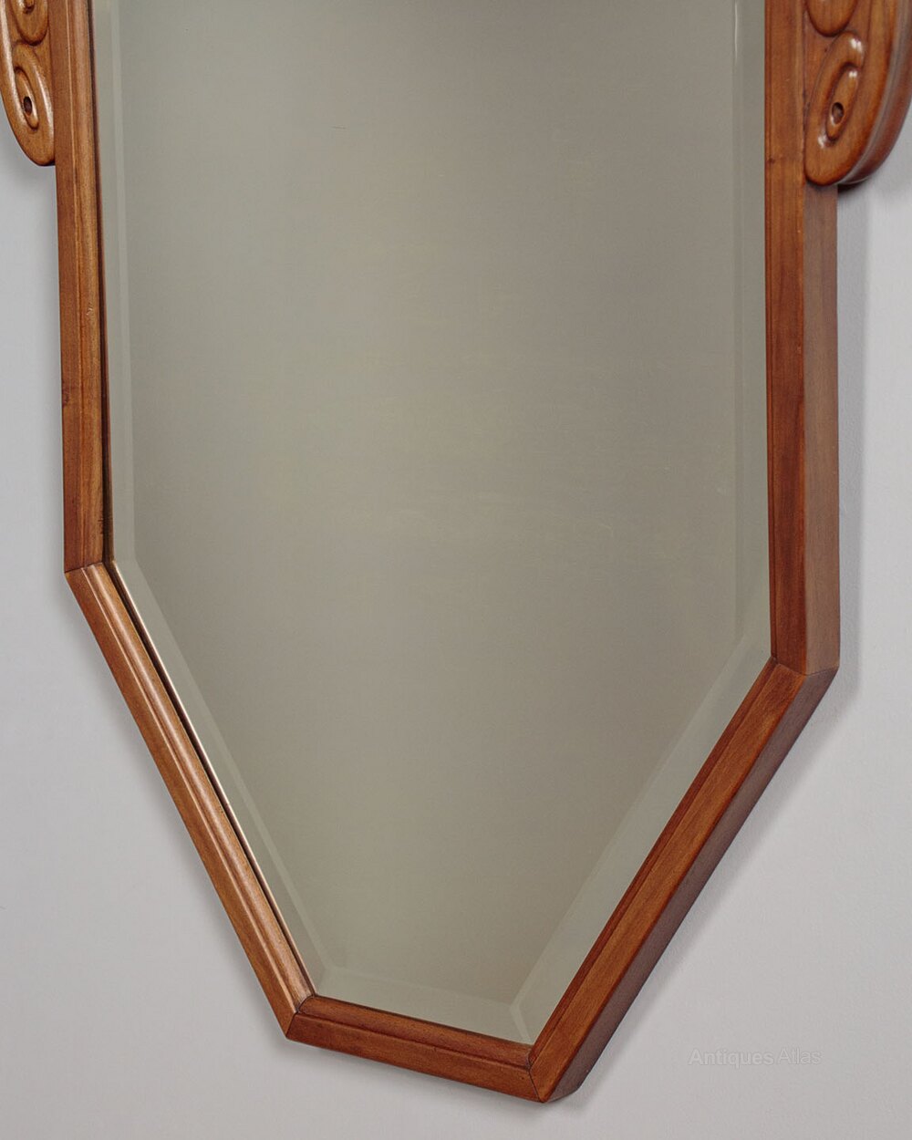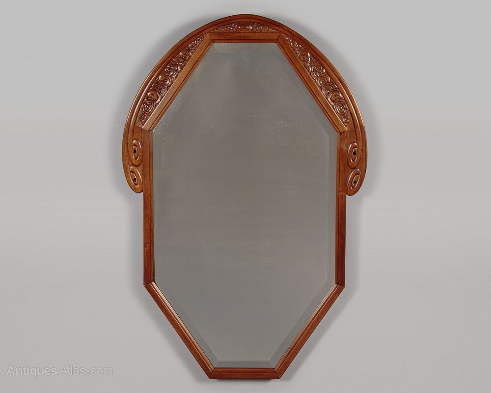 Unusual art deco wall mirror c.1930. Elongated octagonal mirror (width 41" x 23") with a bevelled edge. In a hardwood frame with an arched top and carved decoration. Some shading and tarnish to the mirror plate, otherwise very good condition.