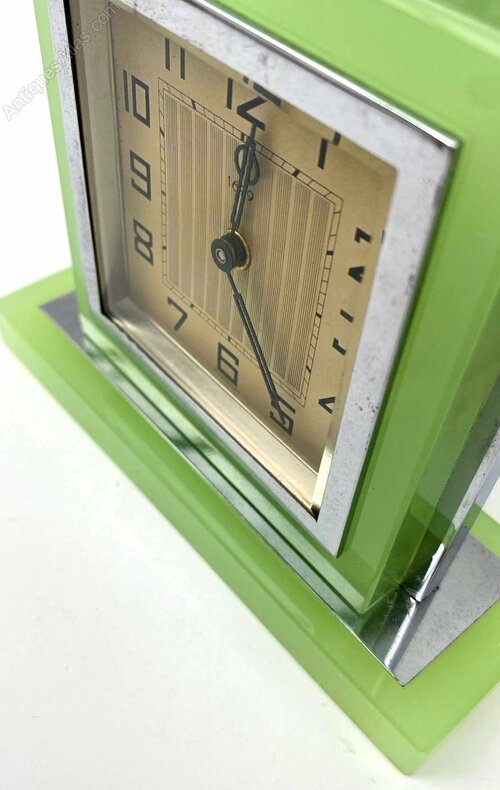 Original 1930's Art Deco green glass 30 hour clock with chrome accents. Perfect size for desk or table. It’s freshly serviced with the mechanism having been through an ultrasonic cleaner, reassembled and lightly oiled so is in good working order and keeps good time. 95 odd years old this clock will live another life time. No damage to report everything is in very good vintage condition. This lovely clock that will enhance any setting.